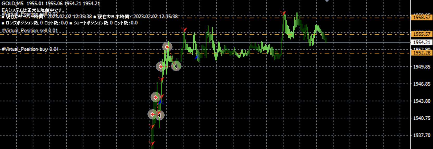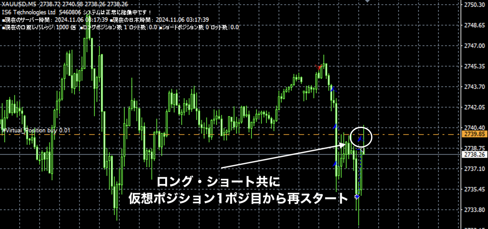 スタッフA:ねぇねぇ、またまたいいこと考えたんだけど! スタッフB:何なに。…って件(くだり)って前にもあったと思うんだけど。。 スタッフA:あぁ、コピーツールの時にも同じような感じだったかな。 でも今日はコピーツールじゃなくて自動売買EAの話ね。 スタッフB:どうした?で、今度は何よ。 スタッフA:いやさ、コピーツールの時に最初のポジションはコピーせずに 後半のポジションのみをコピーしたら利益が増えたじゃん。 それを自動売買EAでやったら面白いかなと思って。 スタッフB:またまた何を言ってんだよ、あんたはwww できるはずないじゃんよ、コピーツールと違うんだから。 スタッフA:確かにそのままの状態ならできないけどさ。 エントリーロジックに対して初期ポジは仮想でエントリーしたものと見なして ナンピンしてきたら途中から実際にエントリーすればいいんじゃないかと。 こんな感じでさ。 ![]() ■下落によるロングナンピン時の様子 スタッフB:な〜に〜?やっちまったな! スタッフA:これ中々面白いと思わない? スタッフB:まるでエントリーしてるみたいじゃん、これ。 スタッフA:そう、だけど実際には初期ポジから3ポジ目まではエントリーしてないから この状態でも含み損は3ポジ分少ないしね。 しかも決済した時もこの3ポジ分の含み損が元々ないから利益も増える。 この3ポジは仮想ポジションだからね。 スタッフB:なるほど、含み損は少なく利益は多くか、確かにそうなるわな。 スタッフA:あれ、驚かないの?前回みたいに。 スタッフB:毎回驚くわけないだろ、ガキじゃあるまいし。 それよりもさ、これってナンピンしてない方の仮想ポジはどうなんの? これだとナンピンした方のポジはリアルポジションが入って利確できるけどさ、 この状態だとショートの仮想ポジだけ残り続けないか? スタッフA:そこは大丈夫、どっちか一方が利確したら仮想ポジがリセットされるから。 こんな感じで。 ![]() ■利確後に一旦ノーポジになり、再スタートされた時の様子(ロングエントリー後) スタッフB:うわーマジか!! 仮想ポジだからいつでもリセットできるんかー、 まるで「右左どっちゲーム」みたいじゃん。 「上か下か、どっち?」みたいな感じで毎回トレードしていくわけね。 スタッフA:まぁそんな感じだよ。 スタッフB:じゃー今回も早速作ってみるかー!! スタッフA:いや、もう出来てるんだよね、実は。 スタッフB:えっ、いつの間に。 てことは今回はオレの出番ないわけね。 スタッフA:うん、もう出来ちゃってるからね。 スタッフB:(ノω。)ピエン |