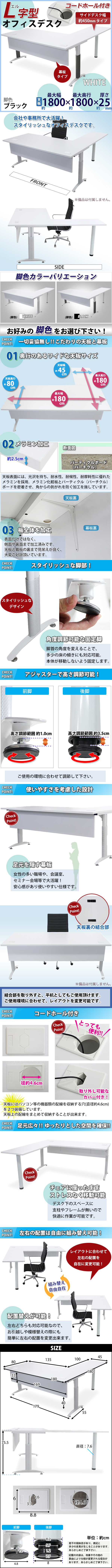 | 商品名 | 送料無料 オフィスデスク デスク L字型 幕板付 コードホール付 約W180×約D180×約H75.5 約W1800×約D1800×約H755 白 平机 ワークデスク 事務机 パソコンデスク PCデスク 事務デスク L字デスク L型 コーナーデスク 会社 事務所 ホワイト 配線穴 t016180whl032hl45 |
