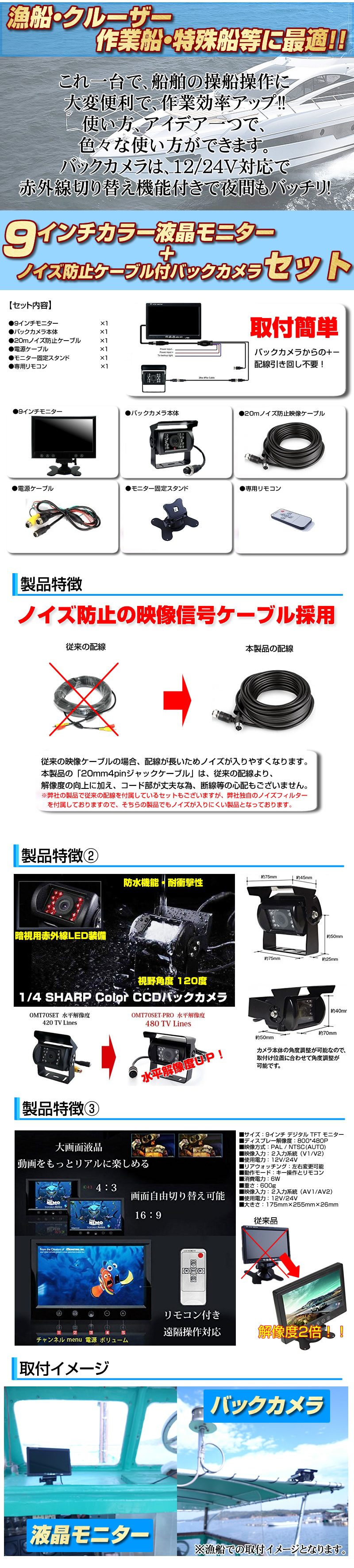 | ■24V車対応の液晶モニター + バックカメラセット 液晶モニターとバックカメラのセットなので、こちらのセットだけでバックカメラをご利用出来ます。 ■9インチオンダッシュ液晶モニター 9インチTFT液晶なので、バックカメラ用としては、十分な大きさです。 また、オンダッシュタイプのため、取り付け場所を選ぶことが出来ます。 ■赤外線LED搭載バックカメラ 赤外線LED搭載モデルのため、視認性が低下し易い夜間でも一定の視認性を確保出来ます。 また、広角カメラなので視認性も高く、より確実な確認が出来ます。 ■ノイズ対策済み 24V車向けカメラでありがちなノイズを軽減出来るノイズ対策済みの専用ケーブルを採用! |