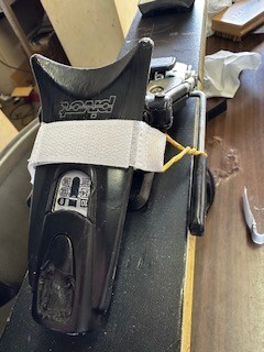ワックス塗りやスキー板を送ったりする時にブレーキストッパーが邪魔にならない様にブレーキの固定します。