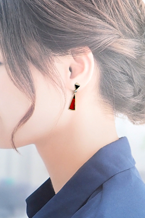 コメントタサキの、揺れ動く幾何学的な三角形のモチーフがモダンな雰囲気のイヤリングです。オレンジとグリーンのコントラストがエレガントな印象を与えてくれます。