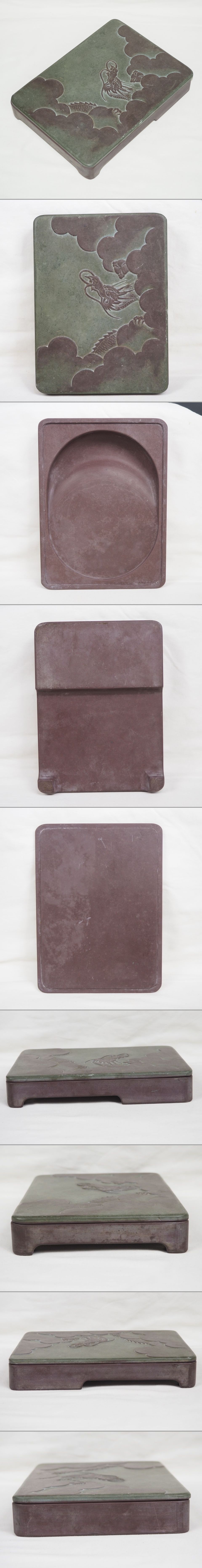 | 商品説明 | 厚さ約 3.5cm 幅約 20×15cm 重さ 2kg ご覧のように、見事な松花石古硯、雲龍文刻古硯です。石の層状構造を生かして、雲龍を見事に表現していて、大変貴重な逸品です。微小擦れがみられますが、とてもよい状態です、詳しくは写真でご確認ください。 |