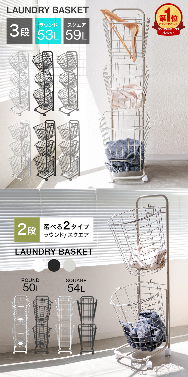 通常のバスケットを分別用に2つ並べて置くと幅を取り、上部にデッドスペースが生まれてしまいます。 こちらの商品は幅約35cmに2つのバスケットを縦に並べることが可能。 デッドスペースを活用することで物が多くなりがちな洗濯機まわりも無駄なくすっきり。 狭くなりがちなスペースを有効に活用することができます。 2つのバスケットは取り外しも可能で、持ち手があるのでベランダに運ぶ時なども便利にお使いいただけます。 キャスター付きで、ラックごとの移動もスムーズです。 ランドリー以外にキッチンの食品ストッカー、リビングの雑貨入れ、おもちゃ収納も使えます! 【商品仕様】 カラー:アースグレー サイズ:(約)幅35×奥行き40×高さ107cm バスケット内寸:(約)直径28(底部)×高さ37cm 重量:(約)3kg 容量:(約)50L(上段25L、下段25L) バスケット耐荷重:(約)10kg 素材:スチール、ナイロン ランドリーバスケット 2段 3段 1段 大容量 ワイヤーバスケット ランドリーラック 洗濯物入れ かご 洗濯かご 洗濯物 脱衣かご ランドリー収納 ランドリーボックス 洋服 衣服 収納 おもちゃ収納 雑貨入れ おしゃれ シンプル 北欧 西海岸 人気 おすすめ WEIMALL |