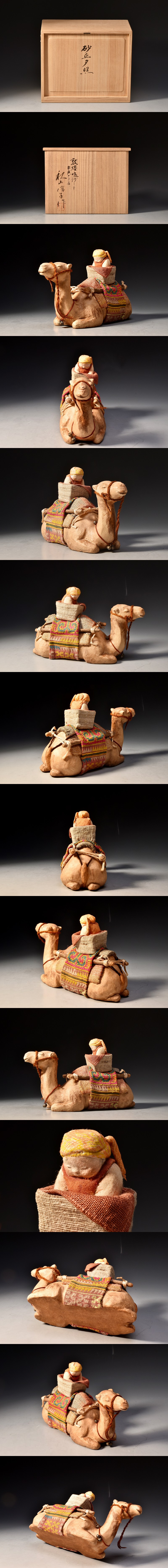 U08678 人間国宝 秋山信子 砂丘 鳴沙山 夕照 駱駝 人物 人形 敦煌 鳴沙にて 共箱 伝統工芸人形展 図録掲載作品 /G183