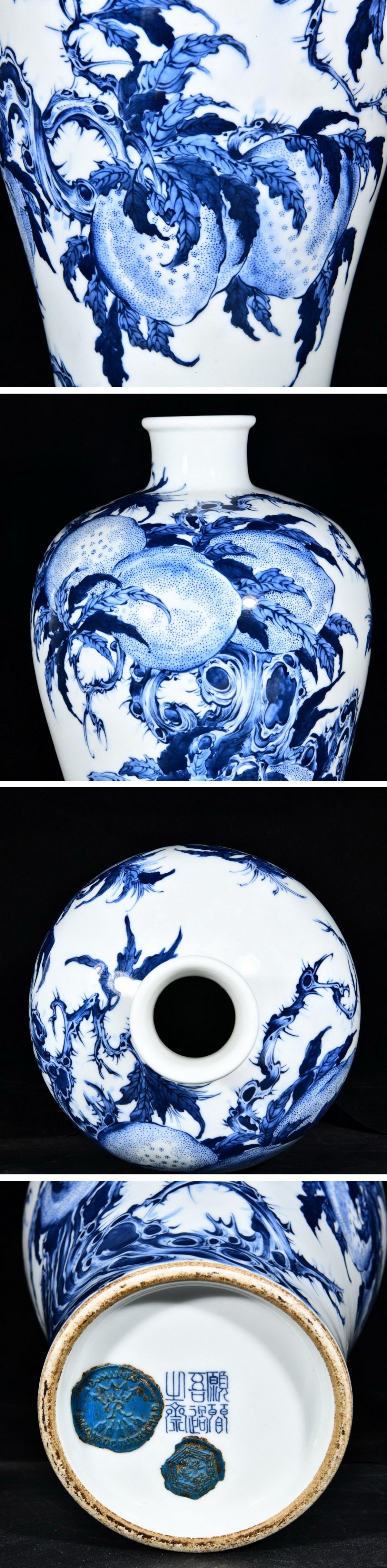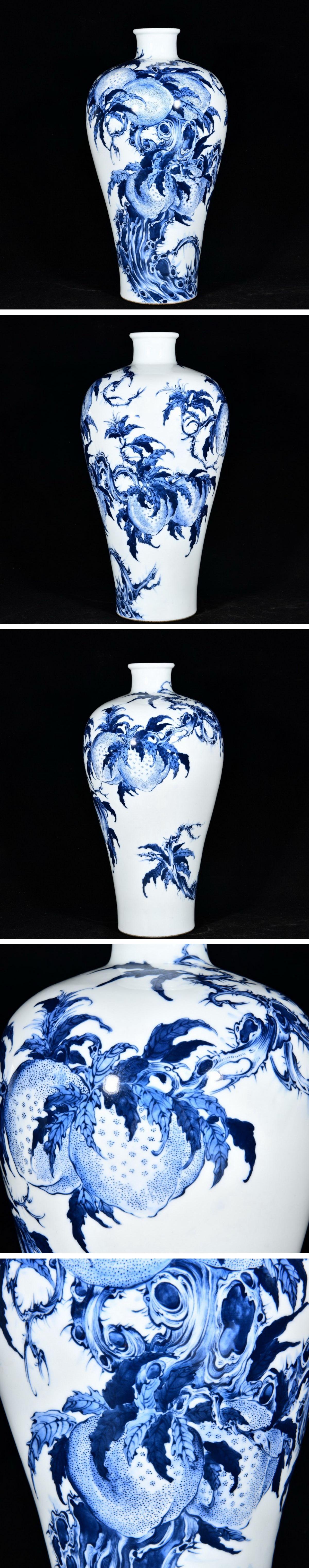 【清】関西某オークション購入 中国・清時代 王歩作 青花寿桃紋花瓶 極細工 古置物 古擺件 中国古美術7L12-RS16