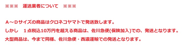 ☆☆ 運送業者について ☆☆ 落札金額(税込み)が10万円を超える場合、 又は梱包後の重量が30kgを超える場合は、 西濃運輸か佐川運輸で発送となり都度見積もりとなります。 2025/08/28現在 クロネコヤマト 税込価格(円) 2025年9月~ | ||