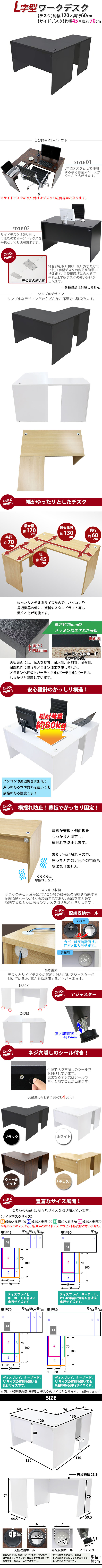 | 商品紹介 | ■作業スペースを広く確保出来る、L字型ワークデスクです。 ■サイドデスクの幅が約45cmのタイプです。 ■会議室や事務所等、オフィス家具として様々なシーンでお使いいただけます。 ■天板には、メラミン加工を施しています。 ■幕板が天板と側面板をがっちりと固定!横揺れを防止します。 ■ネジ穴隠しのシール付き。(サイドデスクのみ付属) ■デスクの天板と幕板に配線収納ホールが2カ所ずつ備わっています。 ■アジャスターで高さの調節が可能です。(高さ調節範囲〜約15mm) ※こちらの商品は、組立て式です。組立てにはプラスドライバーが必要です。お客様でご用意ください。 ※組立図が付属します。 ※サイドデスクの取り付けはデスクの左側専用となります。 ■材質:パーティクル(パーチクル)ボード(メラミン加工)(本体、サイドデスク)、プラスチック(アジャスター、配線収納ホール) ■重量:約42kg(デスク:約29kg、サイドデスク:約13kg) ■総耐荷重:約80kg ●新品商品ではありますが、輸入商品の為、多少の擦り傷などがある場合がございますので、ご納得の上ご購入下さいませ。 ●ご購入後、お客様ご都合によるご返品、ご返金等は一切お受け致しておりません。 ●本商品を使用した際に発生したトラブル、事故につきまして、当社は一切の責任を負いません。ご使用に関しましては、全て自己責任にてお願い致します。 ※カラーはブラックとなります。 |