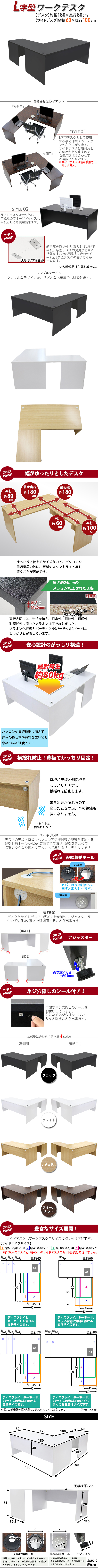 | 商品紹介 | ■作業スペースを広く確保出来る、L字型ワークデスクです。 ■サイドデスクの幅が約60cmのタイプです。 ■会議室や事務所等、オフィス家具として様々なシーンでお使いいただけます。 ■天板には、メラミン加工を施しています。 ■幕板が天板と側面板をがっちりと固定!横揺れを防止します。 ■ネジ穴隠しのシール付き。 ■デスクの天板と幕板に配線収納ホールが2カ所ずつ備わっています。 ■アジャスターで高さの調節が可能です。(高さ調節範囲〜約15mm) ※こちらの商品は、組立て式です。組立てにはプラスドライバーが必要です。お客様でご用意ください。 ※組立図が付属します。 ※サイドデスクの取り付けはデスクの右側専用となります。 ■材質:パーティクル(パーチクル)ボード(メラミン加工)(本体、サイドデスク)、プラスチック(アジャスター、配線収納ホール) ■重量:約68kg(デスク:約47kg、サイドデスク:約21kg) ■総耐荷重:約80kg ●新品商品ではありますが、輸入商品の為、多少の擦り傷などがある場合がございますので、ご納得の上ご購入下さいませ。 ●ご購入後、お客様ご都合によるご返品、ご返金等は一切お受け致しておりません。 ●本商品を使用した際に発生したトラブル、事故につきまして、当社は一切の責任を負いません。ご使用に関しましては、全て自己責任にてお願い致します。 ※カラーはブラックとなります。 |