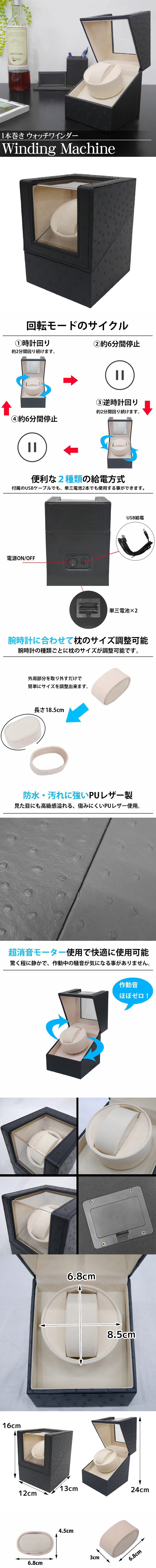 ※商品のカラーは画像一枚目のものになります。 高級感溢れるシックなデザインのワンディングマシーン 型押しPUレザーのボディが上品で豪華な雰囲気を醸し出し、どんなインテリアにも馴染むシンプルなデザインで 時計を守るケースであると同時におしゃれなインテリアとしてお部屋を豪華に飾ってくれます。 ●便利な2種類の給電方式● 付属のUSBケーブル、または単三電池で給電可能です。 有線でも無線でも使え、場所に縛られずに使用出来ます。 ●抜群の静音設計● 磁化なしの設計で、動作中の騒音はほぼゼロに近く、驚くほどの静音性を持っています。 寝室、書斎等に置いて使用しても気になりません。 ●高級感溢れるPUレザー● 汚れや水に強く、傷みにくいPUレザー使用。 精巧なデザインで手触りも滑らかです。 ●巻き上げパターン● 時計回り2分間→停止6分間→逆時計回り2分間→停止6分間のパターンをループします。 ●時計に合わせて枕(クッション)のサイズ調整可能● 腕時計の種類に合わせ、クッションの外側を外して厚みを変えれば クッションのサイズを変えられます、レディース時計もメンズ時計も兼用可能です。 ●商品詳細 サイズ:画像をご参照ください カラー:ブラック(オーストリッチ) 重量:(約) 0.65kg ・内容 ワインディングマシーン本体×1 (腕時計クッション×1) 給電用USBケーブル×1 簡易英文説明書×1 ※単三電池は付属しておりません。 |