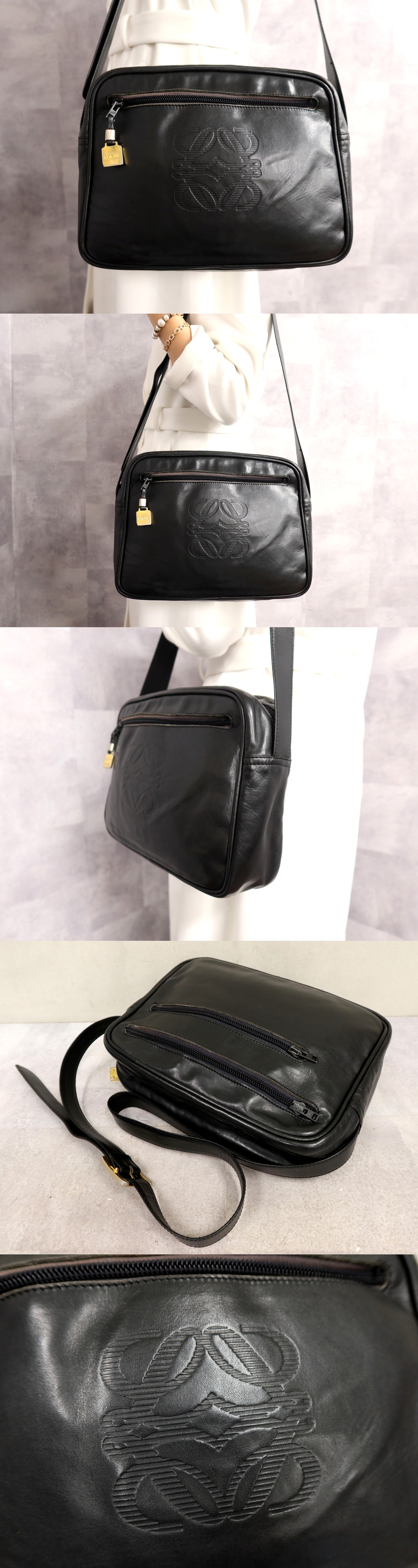 ●超美品●LOEWE ロエベ●アナグラム●ロゴ型押し●カーフ レザー 本革●ショルダー バッグ●黒●ゴールド金具●斜め掛け●かばん●Js63357
