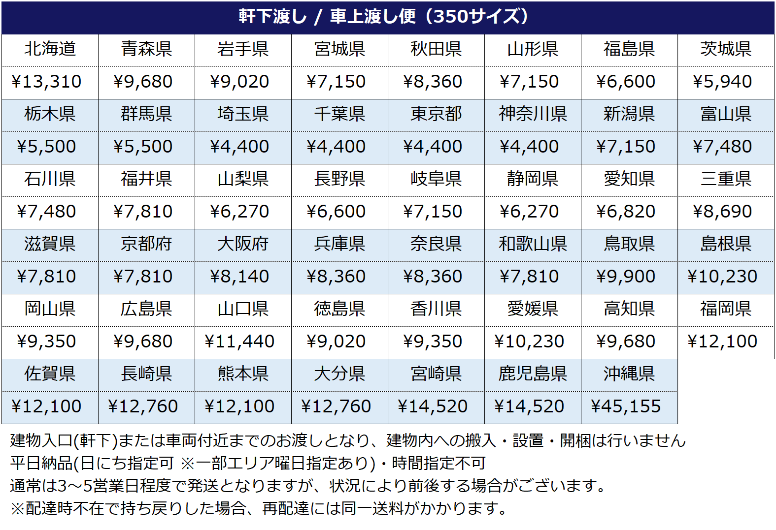 以下配送方法をご案内させて頂きます。 ご落札金額(税込み)+送料の合計をお支払下さい。 ※複数点ご購入の場合、落札数量×都道府県別料金=送料金額となります。 |