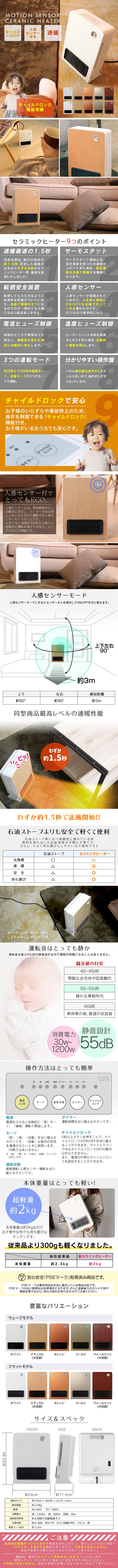 人の動きを感知して自動でON/OFFする人感センサー付きセラミックヒーターです。 人の動きを感知して自動運転するので、節電に効果的です。 電気式ヒーターなので、電源が入ると、すぐに温風がでます。 コンパクトサイズでスペースを取らないので、トイレや洗面所やキッチンなど狭い場所に最適です。 温風2段階切替で1200W・600Wの切り替えができます。 使用目的に応じて、人感センサー自動運転と常時運転の切り替えができます。 約2kgの超軽量! 女性や子供でも持ち運びラクラクです♪ 【商品仕様】 ・カラー:ホワイト(フラットタイプ) ※本体前面以外は白色となります ・サイズ:(約)幅240×奥行115×高さ330mm ・重量:(約)2kg ・消費電力:(強)1200W / (弱)600W ・電源:AC100V 50/60Hz ・コード長:(約)1.5m ・センサー感知範囲:上下90°、左右90°(センサー感知距離 約3m) ・素材:耐熱ABS、アルミ 他 ★ウェーブ(波型)タイプはこちら↓★ 【ウェーブタイプ NBC004】 【注意事項】 ※お風呂場等の水気のある場所や不安定な場所でのご使用はおやめください。 ※長時間運転の場合は、長時間同じ向きのままパネルに熱を持つと溶けてしまう 恐れがございますので長時間ご使用される場合はルーバーの風向きがパネルに 長時間ご使用される場合はルーバーの風向きがパネルに当たり続けない角度など お客様元にてご調節をお願い致します。 ※燃えやすいもの、電化製品の近くには設置しないでください。事故の原因になります。 ※海外でのご使用は出来ません。 |
