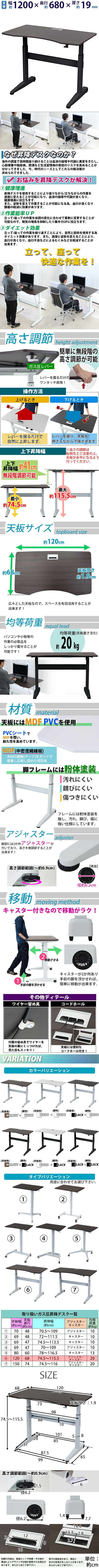 | 商品サイズ | ■本体寸法・・・約W120x約D68x約H74.5~115.5(cm) ■梱包サイズ(2個口)・・・天板:W約128×D約75×H約5.5(cm) 脚:W約111×D約36×H約14(cm) |