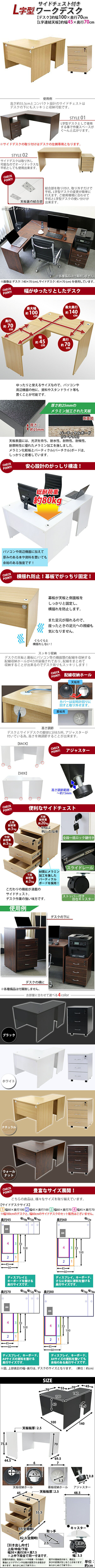 | 商品紹介 | ■作業スペースを広く確保出来る、L字型ワークデスクです。 ■サイドデスクの幅が約45cmのタイプです。 ■使いやすさ抜群の3段サイドチェスト付き。 ■引き出しは鍵を掛けると全段オールロック! ■会議室や事務所等、オフィス家具として様々なシーンでお使いいただけます。 ■天板には、メラミン加工を施しています。 ■幕板が天板と側面板をがっちりと固定!横揺れを防止します。 ■ネジ穴隠しのシール付き。(サイドデスクのみ付属) ■デスクの天板と幕板に配線収納ホールが2カ所ずつ備わっています。 ■アジャスターで高さの調節が可能です。(高さ調節範囲〜約15mm) ※こちらの商品は、組立て式です。組立てにはプラスドライバーが必要です。お客様でご用意ください。 ※組立図が付属します。 ※サイドデスクの取り付けはデスクの左側専用となります。 ■材質:パーティクル(パーチクル)ボード(メラミン加工)(本体、サイドデスク、サイドチェスト)、プラスチック(アジャスター、配線収納ホール、キャスター)、カークサイト(亜鉛合金)(取っ手、鍵)、スチール(スライドレール) ■重量:L字型デスク:約41kg (デスク:約28kg、サイドデスク:約13kg) サイドチェスト:約20kg ■L字型デスク総耐荷重:約80kg ■サイドチェスト耐荷重:約20kg(天板(引き出しに何も入っていない時))、約3kg(各引き出し) ■付属品:鍵2個(内スペアキー1個)、組立図 ●新品商品ではありますが、輸入商品の為、多少の擦り傷などがある場合がございますので、ご納得の上ご購入下さいませ。 ●ご購入後、お客様ご都合によるご返品、ご返金等は一切お受け致しておりません。 ●本商品を使用した際に発生したトラブル、事故につきまして、当社は一切の責任を負いません。ご使用に関しましては、全て自己責任にてお願い致します。 ※カラーはナチュラルとなります。 |