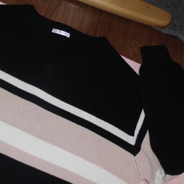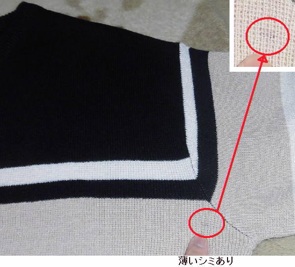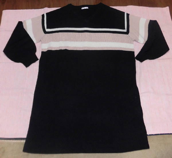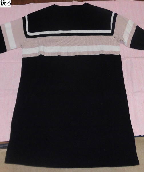 | 1回使用しただけだと思うのですが、左ワキに小さいシミのようなものがあります。 それ以外は比較的キレイです。 ☆ サイズはM ☆ 色は黒、ベージュと白のボーダー入り ☆ 実寸は、身丈89センチ、肩幅51センチ、袖丈50センチ、 脇下の幅55センチ、裾幅57センチ、ひざが隠れる丈 ☆ アクリル100%、やや厚手 ☆ Vネック ハニーズ | ||