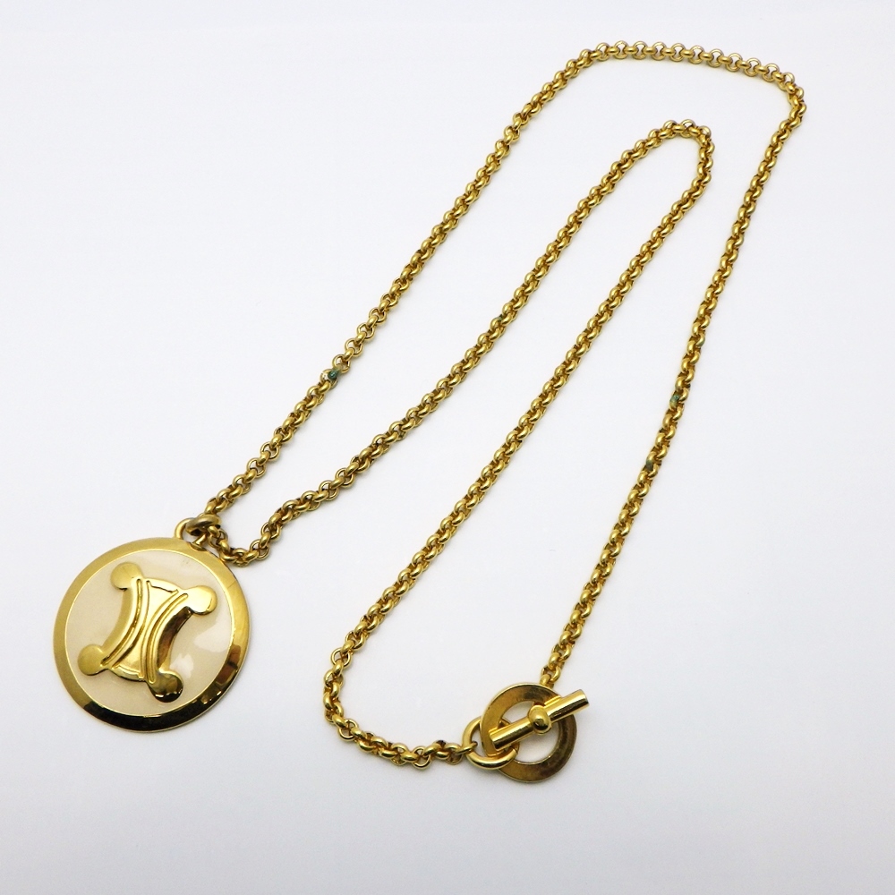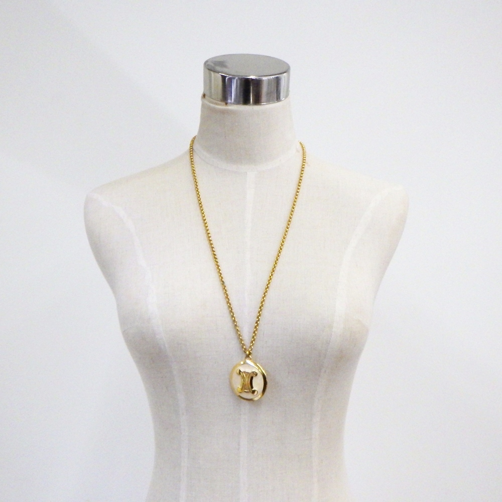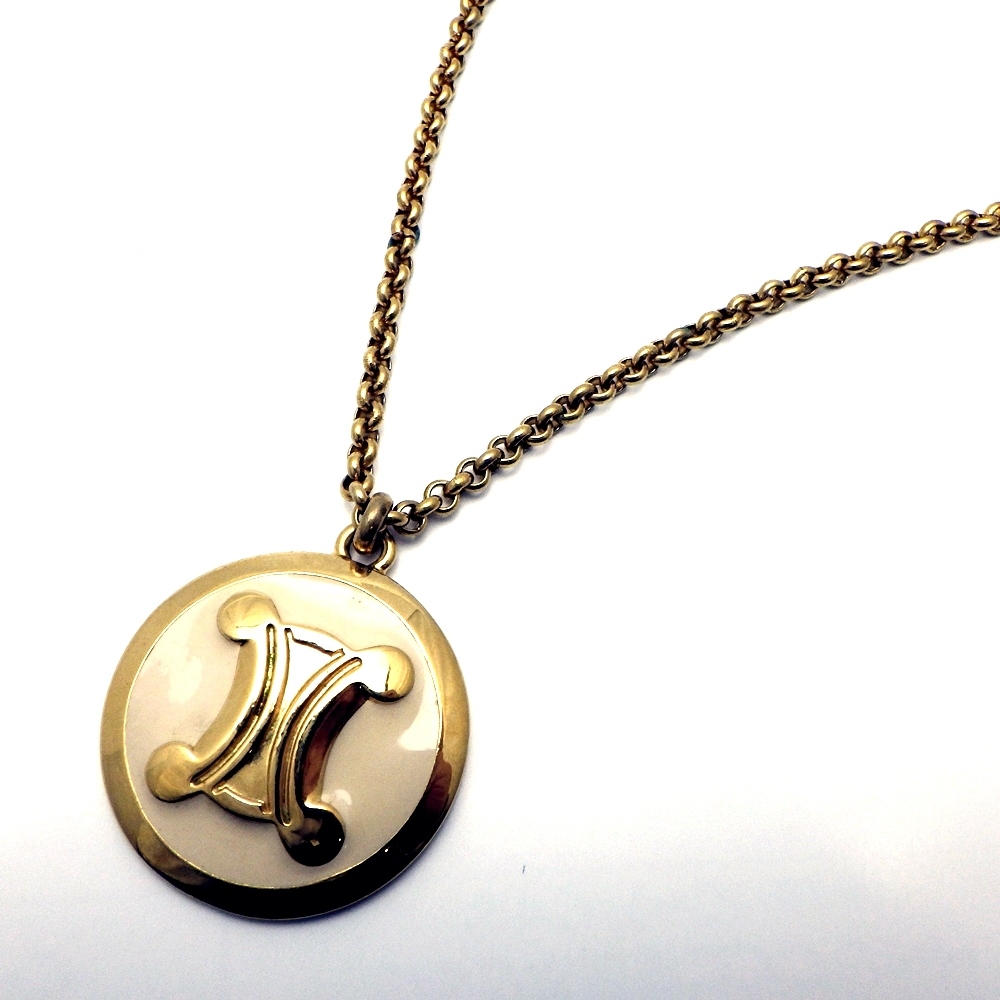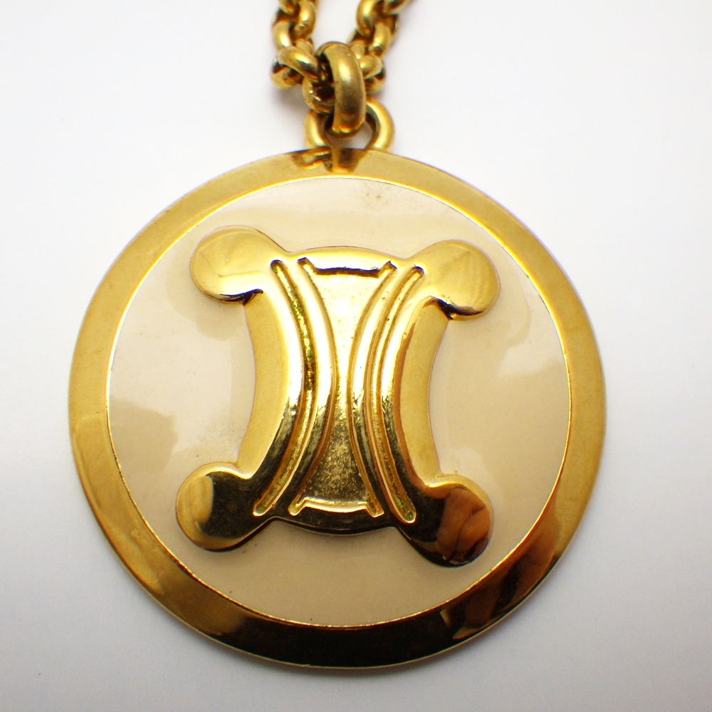 A25-2537 CELINE セリーヌ ネックレス マカダム トリオンフ ラウンド ゴールド×アイボリー エナメル ロング 大ぶり ヴィンテージ