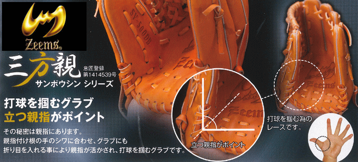 | 【三方親とじ】 ・ジームス独自の三方親シリーズ。捕球面土手部の親指付け根に指の関節と同じように曲げやすくするために縦にレースを通し、親指を使いやすくした仕様。親指が立つ分、しっかり打球を掴むことができ、逆シングルでも不安なく打球を処理できます。 |