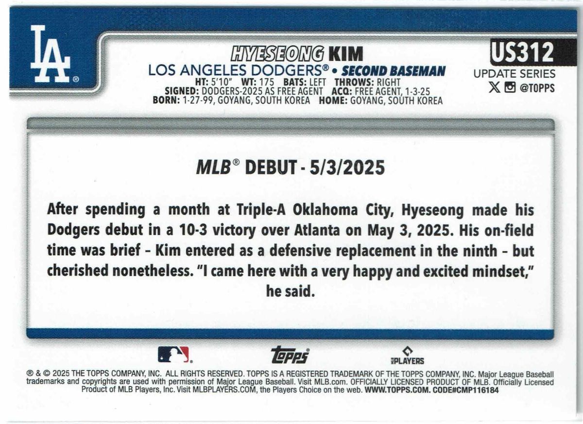 2025 Topps Update #US312 キムヘソン Hyeseong Kim RC Debut - Dodgers ドジャース
