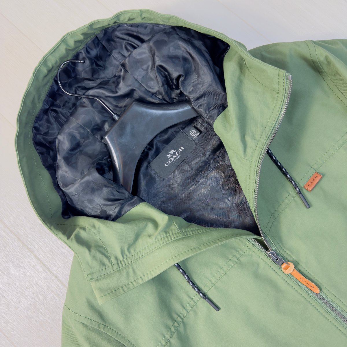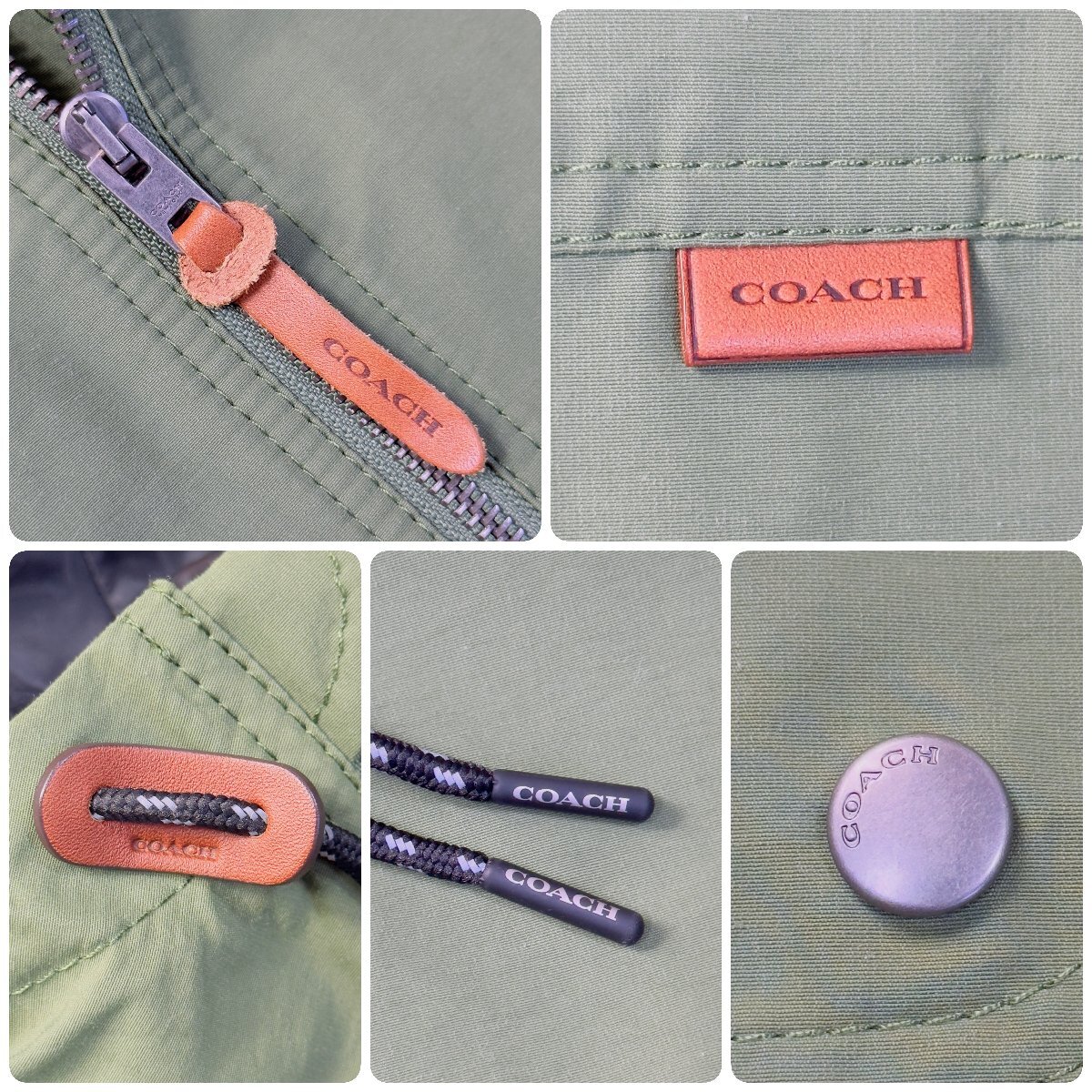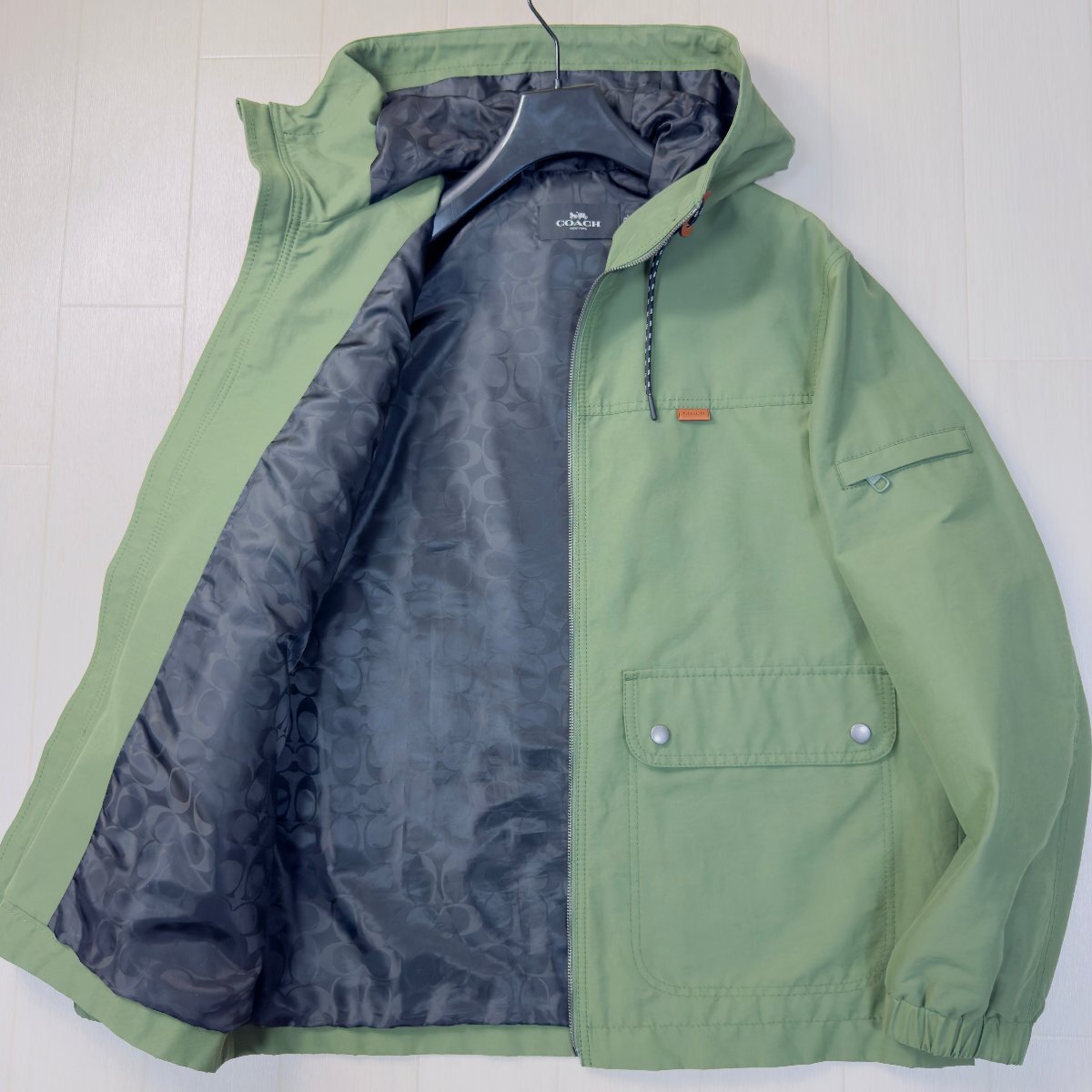 美品/L-XL相当★コーチ COACH シグネチャー総柄 マウンテンパーカー フーデットジャケット ブルゾン 牛革 レザートリミング メンズ カーキ