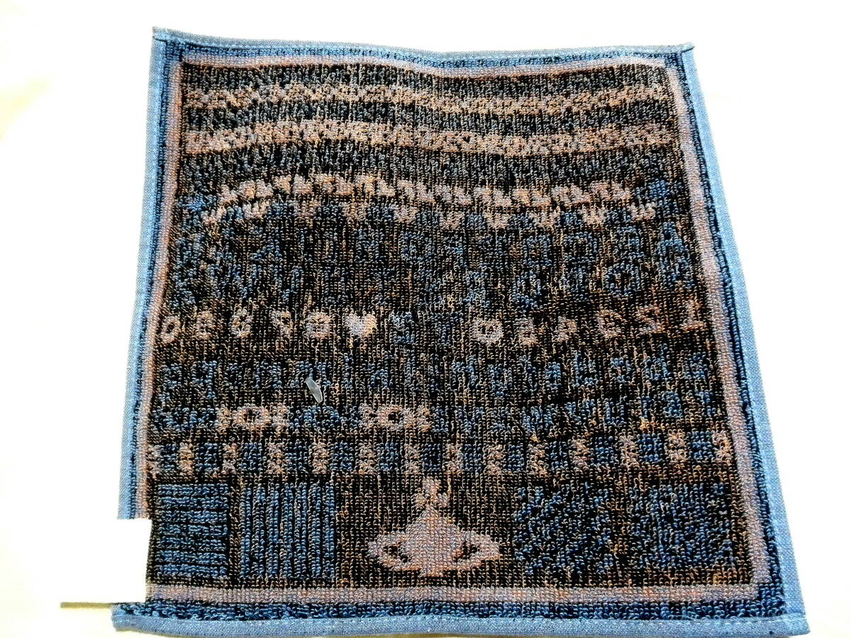 ☆ 中央オーブ柄。全体ダークブルー。柄は淡いオレンジピンク・ブラック基調の厚手ハンカチです。