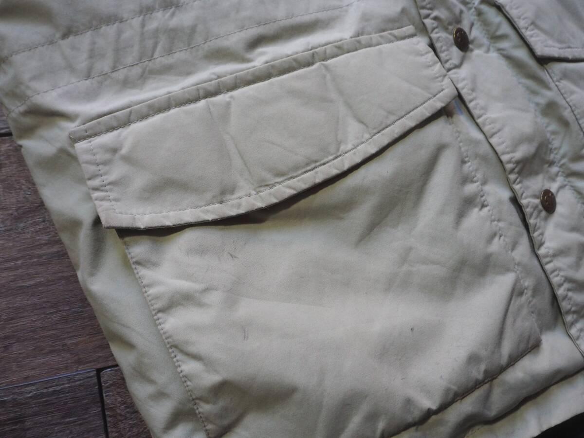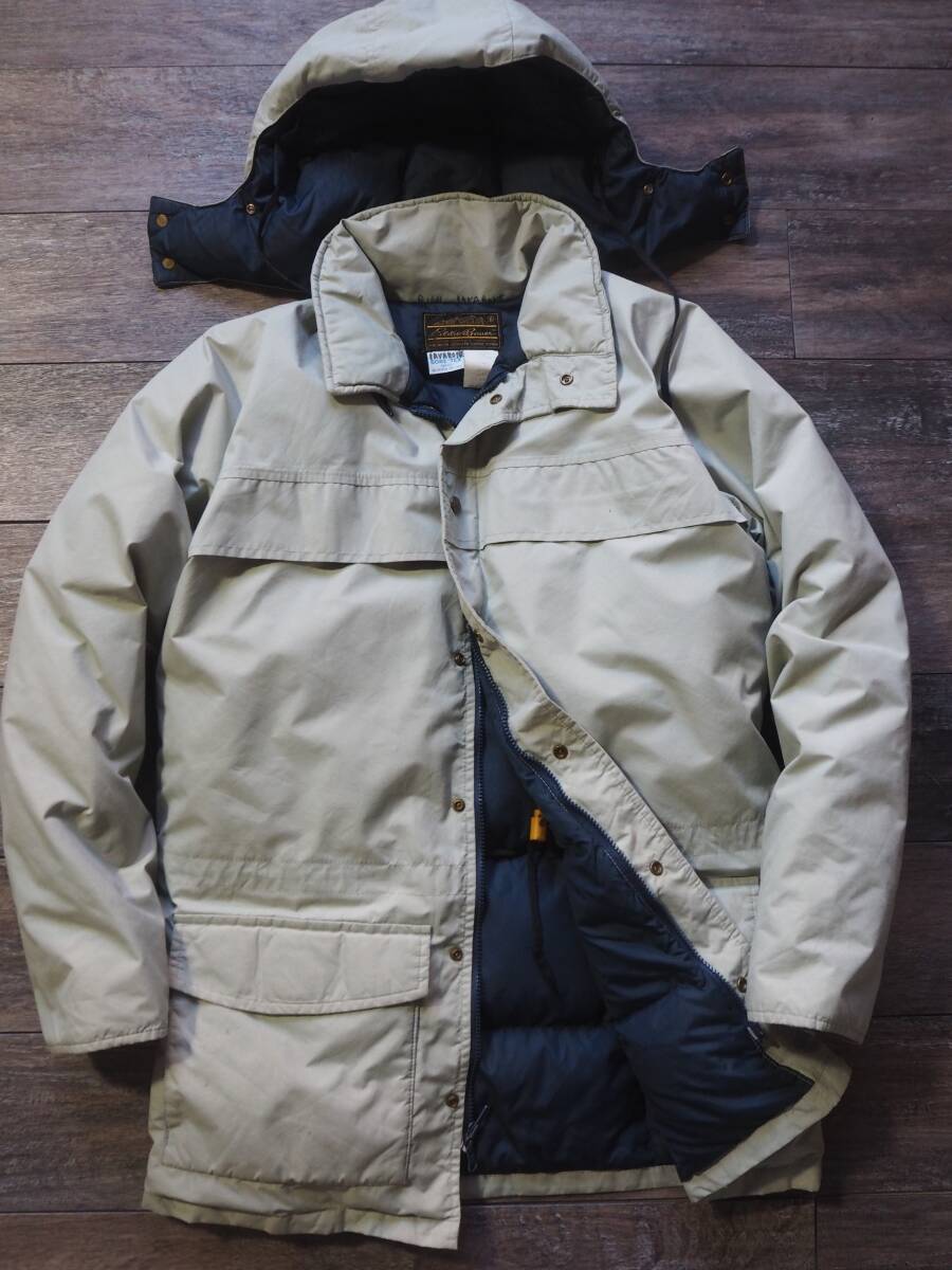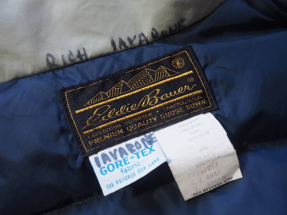 こちらは90年代初頭、黒タグエディーバウアー 高級ライン ダウンジャケットです。 アウターシェルに防水透湿性に優れたゴアテックスラミネートが施し、インシュレーションにはプレミアムクオリティ・グースダウンを贅沢に使用。 脱着式のフードに加え、外気の侵入も防ぐ事が可能なドローコードを配し極寒時にも耐ええる一着です。 保管状態が良く当時ハイスペックモデルを十分に味わえます。 90s Eddie Bauer 黒タグ 高級ライン GORE-TEX グースダウンジャケット USA製 size USA-M 素材 シェル 100% NYLON Filling GOOSE DOWN 裏地 100% NYLON YKK VISLONダブルジップ、ドローコード、フード付属。 裾のドローコードは欠品と思われます。 MADE IN USA 実寸 身幅 64cm 裄丈 90cm 着丈 86cm コンディション 右ポケット部の僅かな汚れ跡程度。あまり気にならないレベルですがビンテージ品につきご理解頂ければと思います。ネームはアジ程度の感覚で全体的に綺麗です。ジップは普通に使用できますがダブルジップの下側を上げる際はたまに引っかかりますので丁寧にお願いします。上側は全く問題ありません。 張りのあるシェルの質感やタフな作り、優れた保温性等、USA製80sエディならではの一着です。 サイズ感は日本人相当でL程度です。 宜しくお願い致します。 | ||||