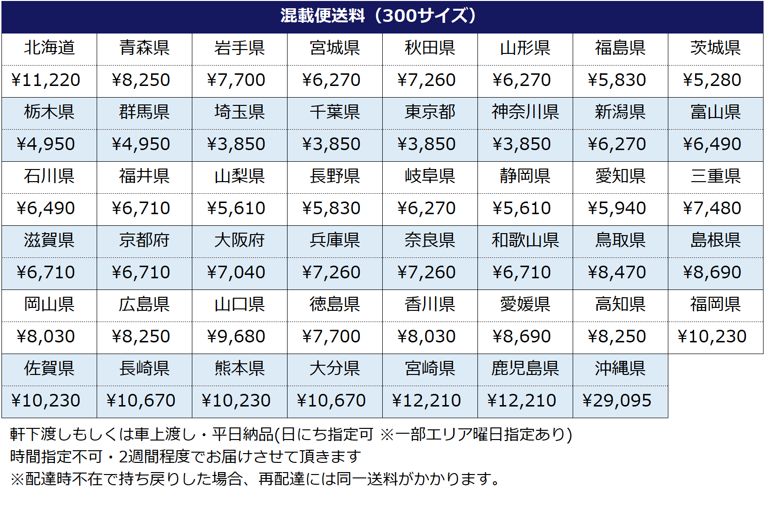 以下配送方法をご案内させて頂きます。 ご落札金額(税込み)+送料の合計をお支払下さい。 ※複数点ご購入の場合、落札数量×都道府県別料金=送料金額となります。 |