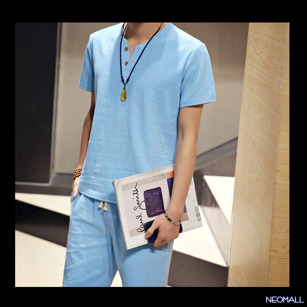 1スタ☆【276】 新品 サマーコットン ヘンリーネック セットアップ ブルー 2XLサイズ 春 夏 部屋着 ルームウエア
