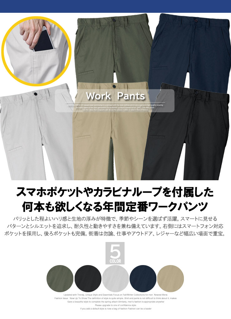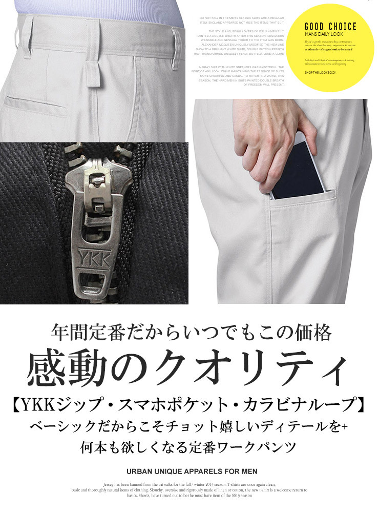 | 商品説明 | 王道のT/C素材をベースに、誰でも気軽に着用できるよう設計されたベーシックワークパンツです。 |
