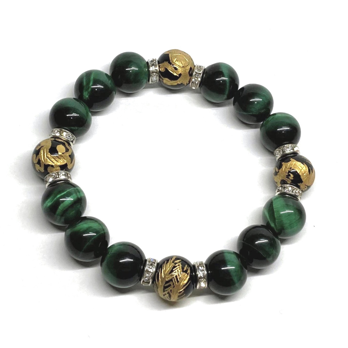 こちらは、四神獣金彫オニキとグリーンタイガーアイを組み合わせたパワーストーンブレスレットです。四神獣は、中国の伝説で4つの方向(東西南北)を守護する神聖な神。四神獣、厄災から身を守り、多くの運気を呼び込むと言われております。石大きさは程よくインパクトのある12mm玉で内周 約17cmです。 数に限りがございますので気になる方はお早めにどうぞ。