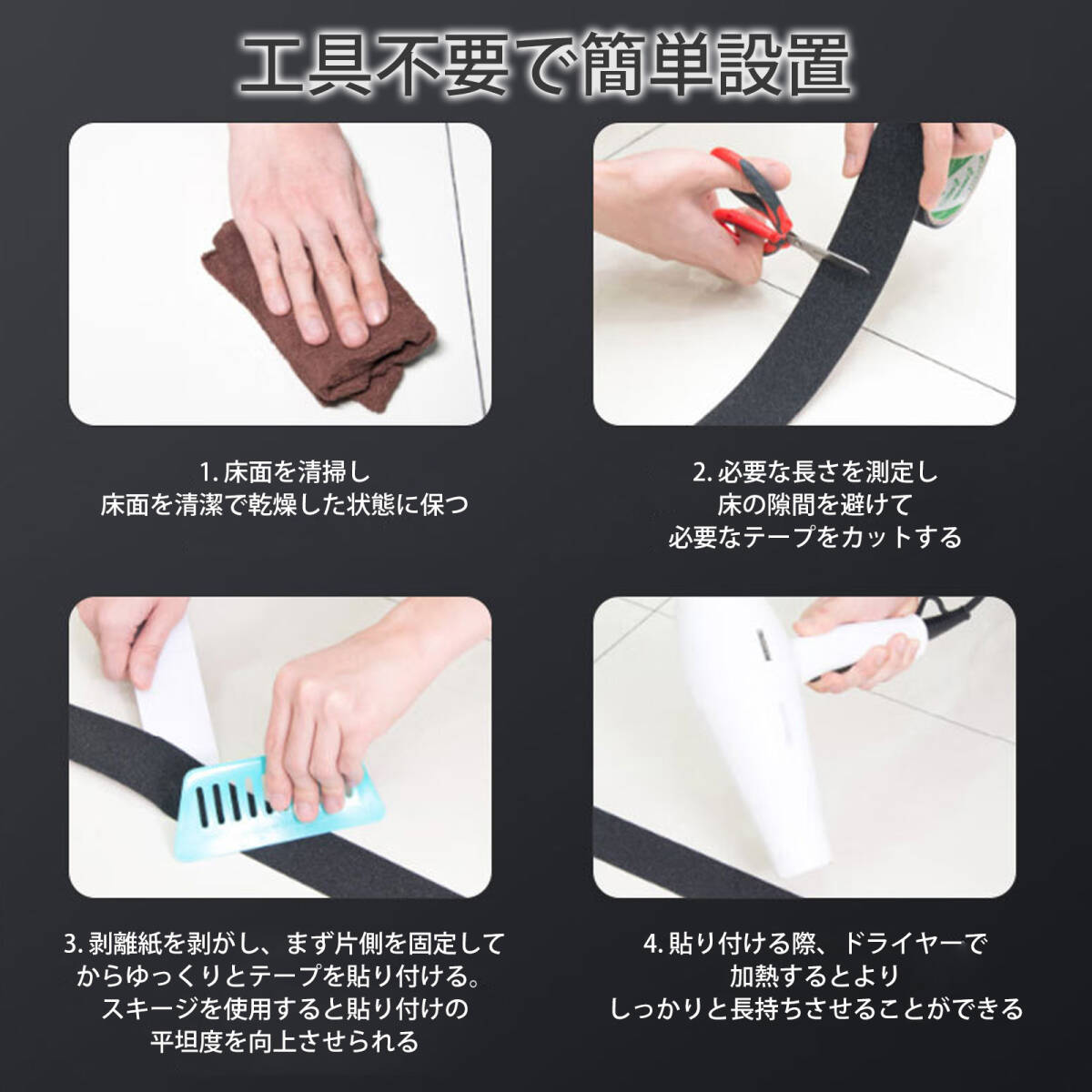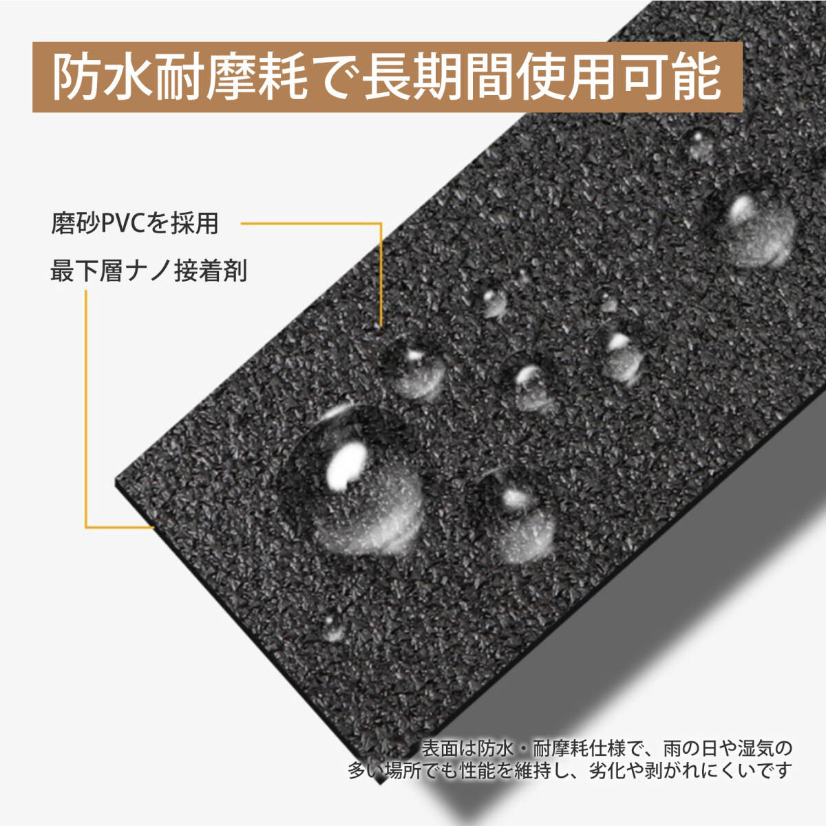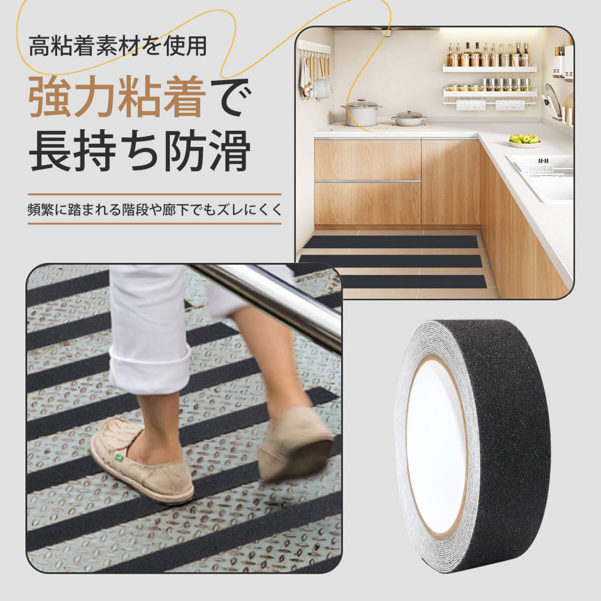 | この商品について | 【耐久性抜群のPVC素材】:摩擦に強い磨砂PVCを採用。長期間使用しても剥がれにくく、優れた防滑効果で転倒リスクを軽減します。 【強力粘着&剥がしても跡残りなし】:高品質の油性粘着剤を使用。強力に固定できるのに、剥がす時はきれいに剥がせてベタつかず、後処理の手間を省きます。 【工具不要・簡単施工】:裏面に強力な粘着テープ付き。貼るだけで設置完了。家庭はもちろん、工場や病院などの業務用現場でもすぐに使えます。 【自由にカット可能】:必要なサイズにハサミやカッターでカット可能。階段、廊下、スロープなど多様なシーンに合わせて自由に調整できます。 【幅広い使用シーン】:製造業や商業施設、病院、サービス業から家庭まで、幅広く活躍。階段やフロアの安全対策に最適です。 |