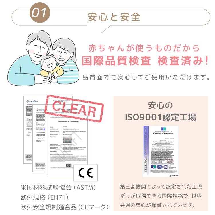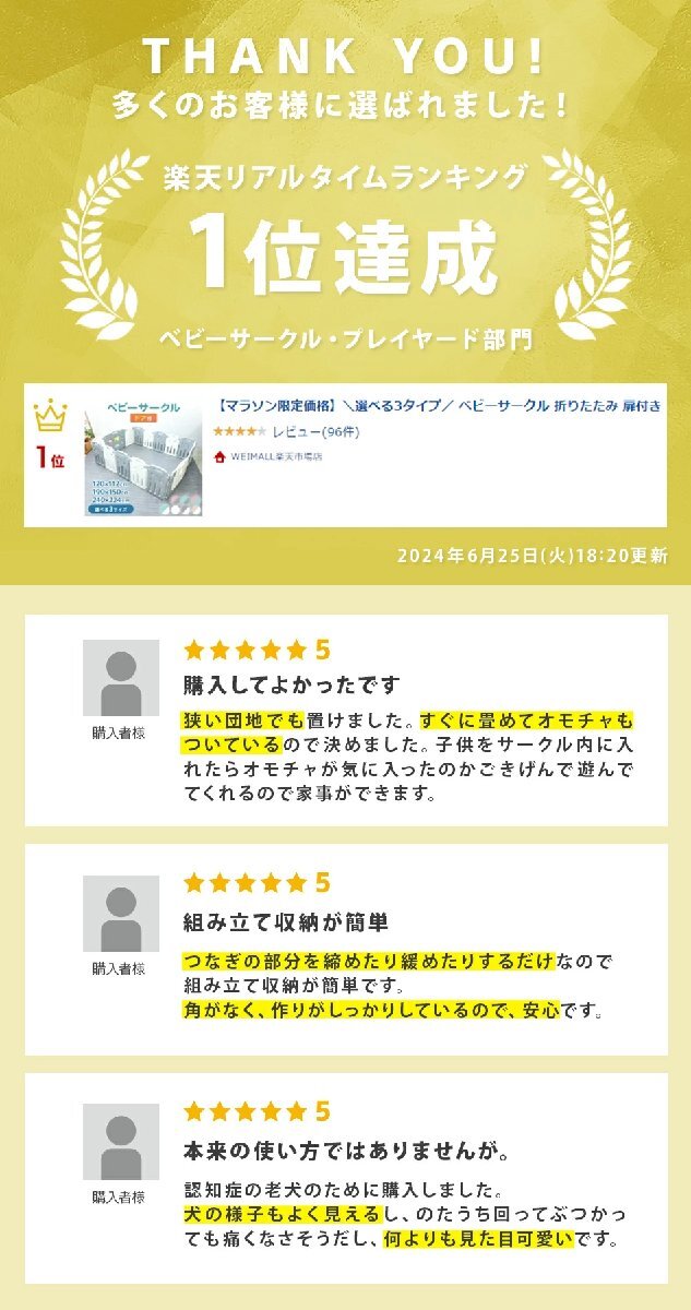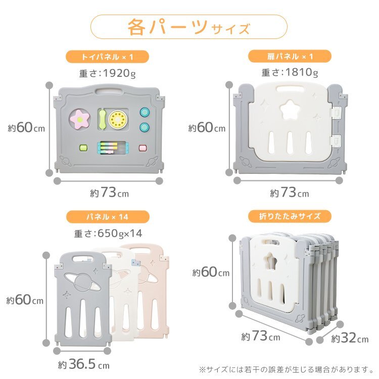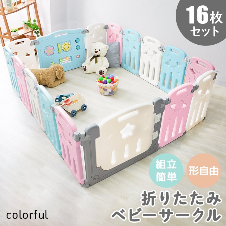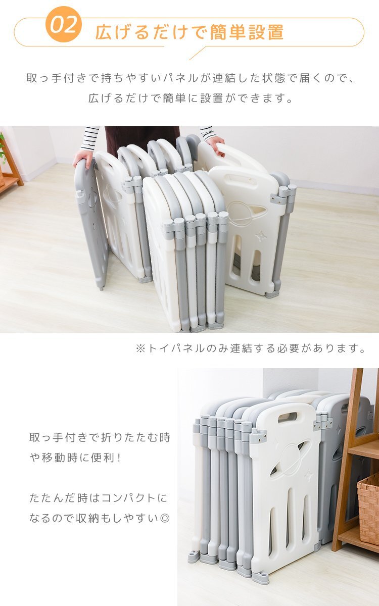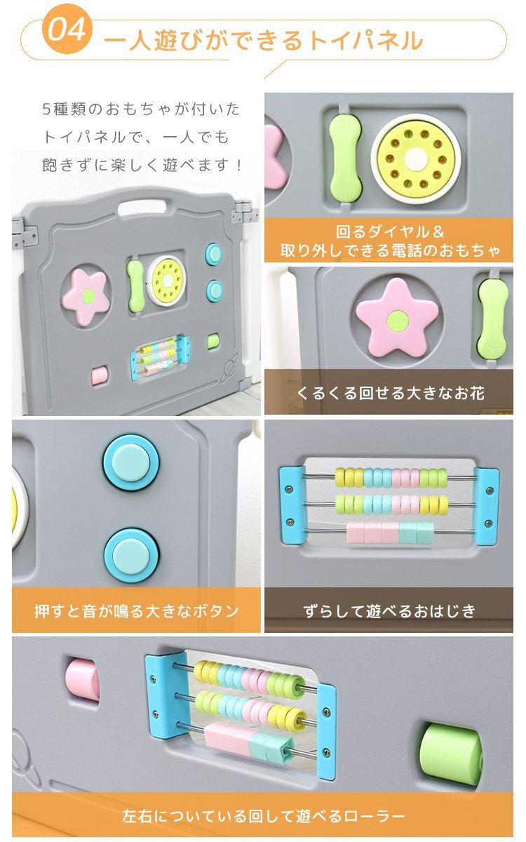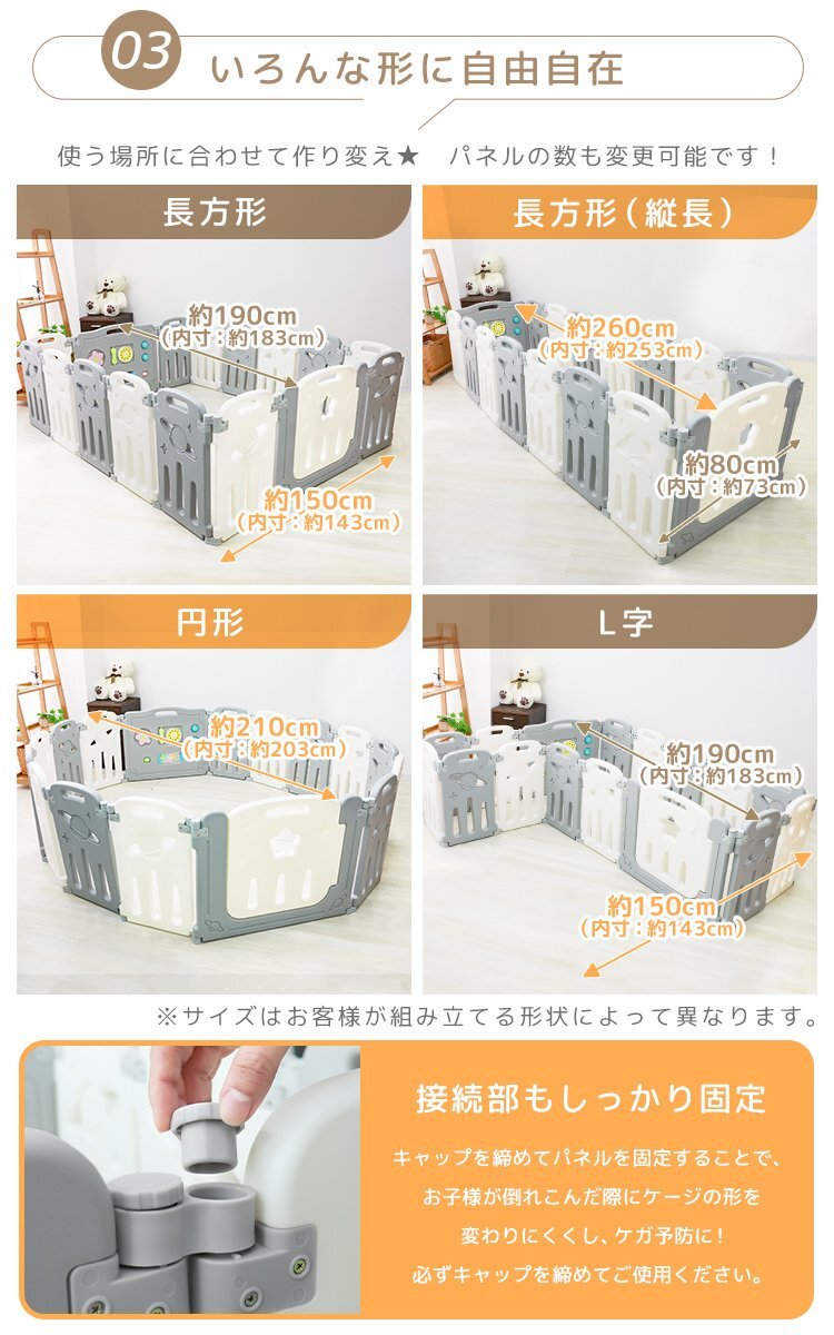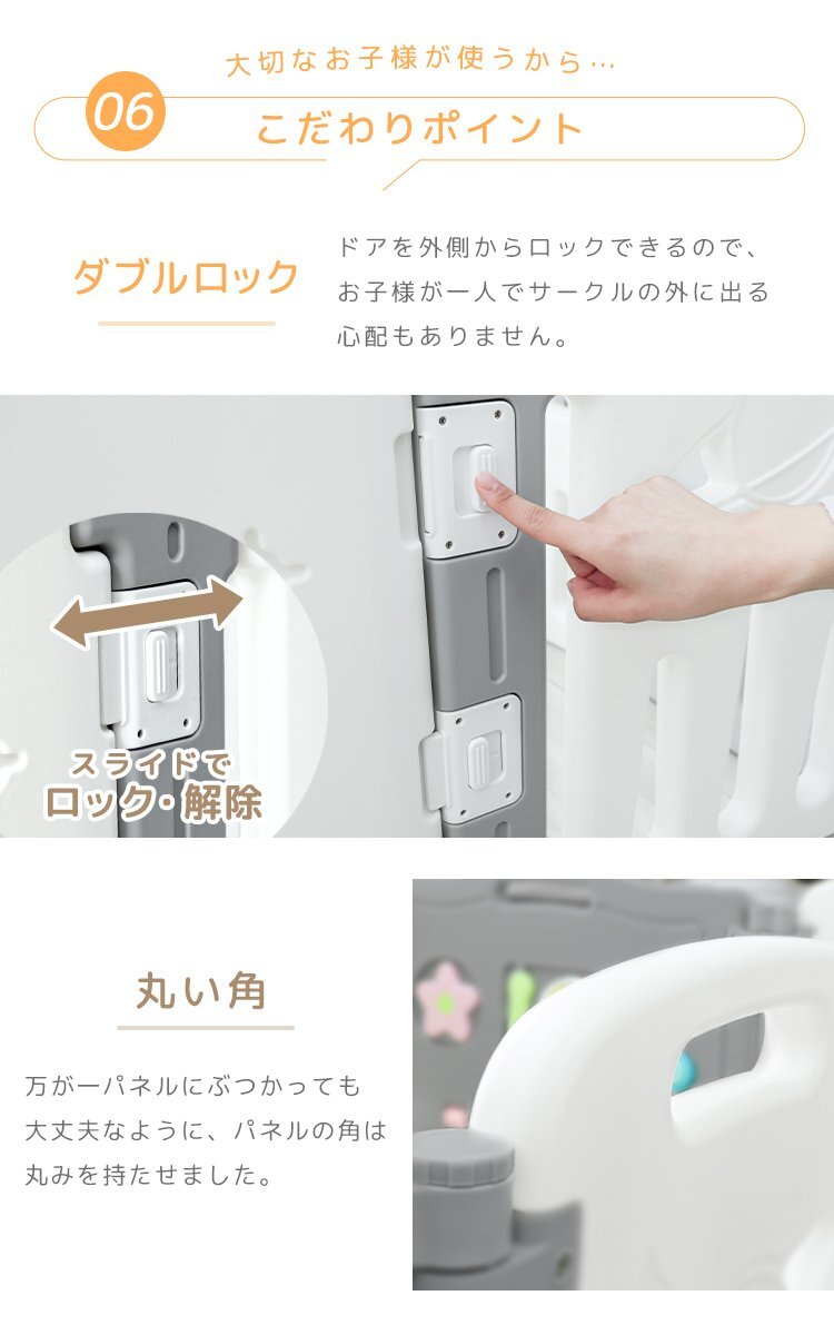お子様に安全な軽くて柔らかい素材と丸みを帯びたデザイン! ママにも簡単に組み立てられるベビーサークルです。 赤ちゃんの脳の発達を助けるトイパネルも付いています。 工具不要で組み立て簡単! お好みの形に広げて接続部分のキャップを締めて固定するだけ! 外側から扉をロックすることができるので、お子様が勝手に外へ出てしまう危険性がありません。 お手入れはサッと拭くだけ! 組み立てたまま拭けるのでお手入れも簡単! いつでも清潔を保てます。 また、当店人気商品の プレイマット や ジョイントマット カラーボール との組み合わせも相性抜群です★ 【商品仕様】 こちらは16枚セット/ホワイトの商品ページとなります 内容:おもちゃパネル×1、扉パネル×1、パネル×14 対象年齢:6ヶ月から8歳頃まで 素材:ポリエチレン 【注意事項】 ・本製品の組み立て、設置は、必ず保護者の方が正しく行ってください。 ・必ず保護者のもとでご使用し、お子様の行動には十分ご注意ください。 ・暖房機器や火気の近く、または屋外では使用しないでください。破損や変形の原因となります。 ・パネル縁、柵の隙間の処理時、カッターでのバリ処理を行っております。 その為、バリ処理跡やへこみなどがある場合がございます。 こちらは製造上発生する跡の為、跡の状況によってはご返品、交換のご対応ができない場合がございます。 バリ処理には細心の注意を払っておりますが、万が一バリを見つけられた場合は、カッターで削り処理をお願い致します。 ・イメージ違い、お子様がかじるなどでのご交換、返品はできかねます。予めご了承ください。 ・商品は、モニターによって色合いが異なって見える場合があります。 ・仕様・デザインは改良のため予告なく変更することがあります。 |