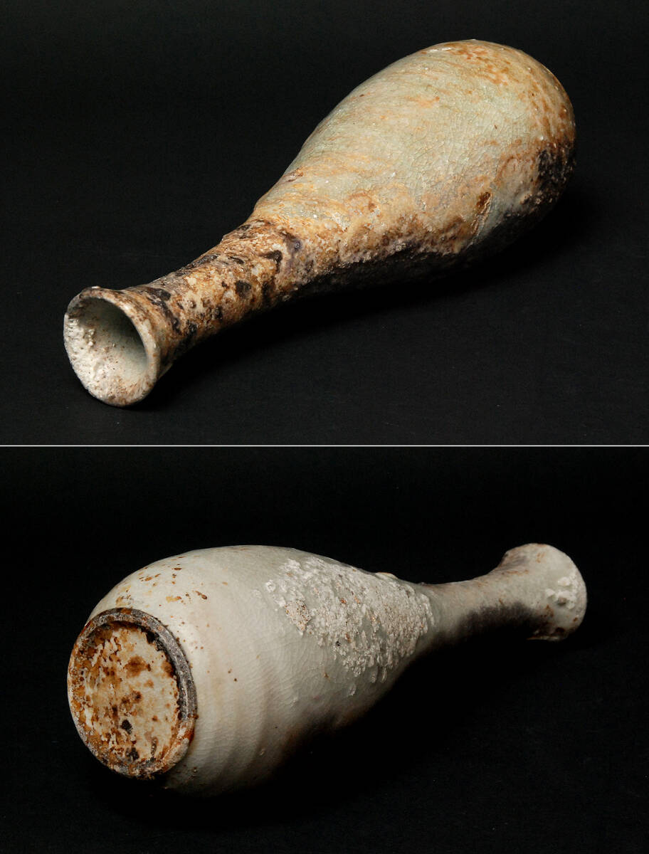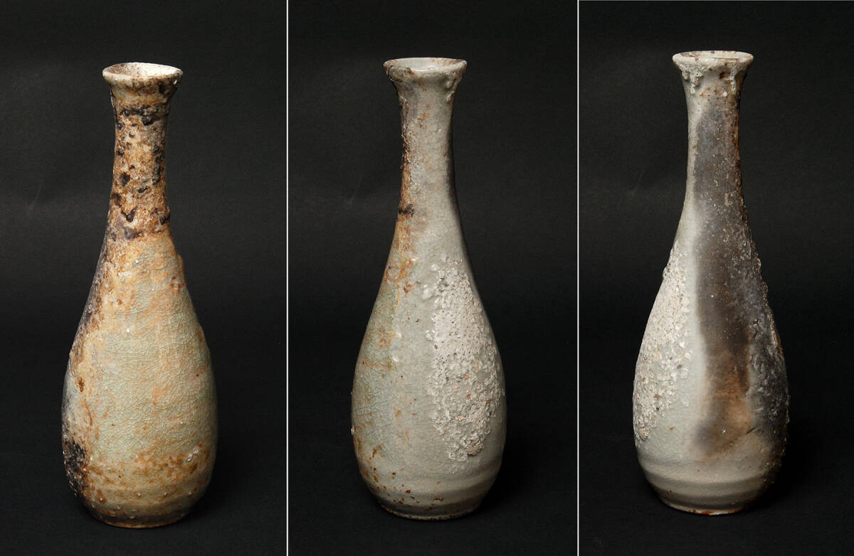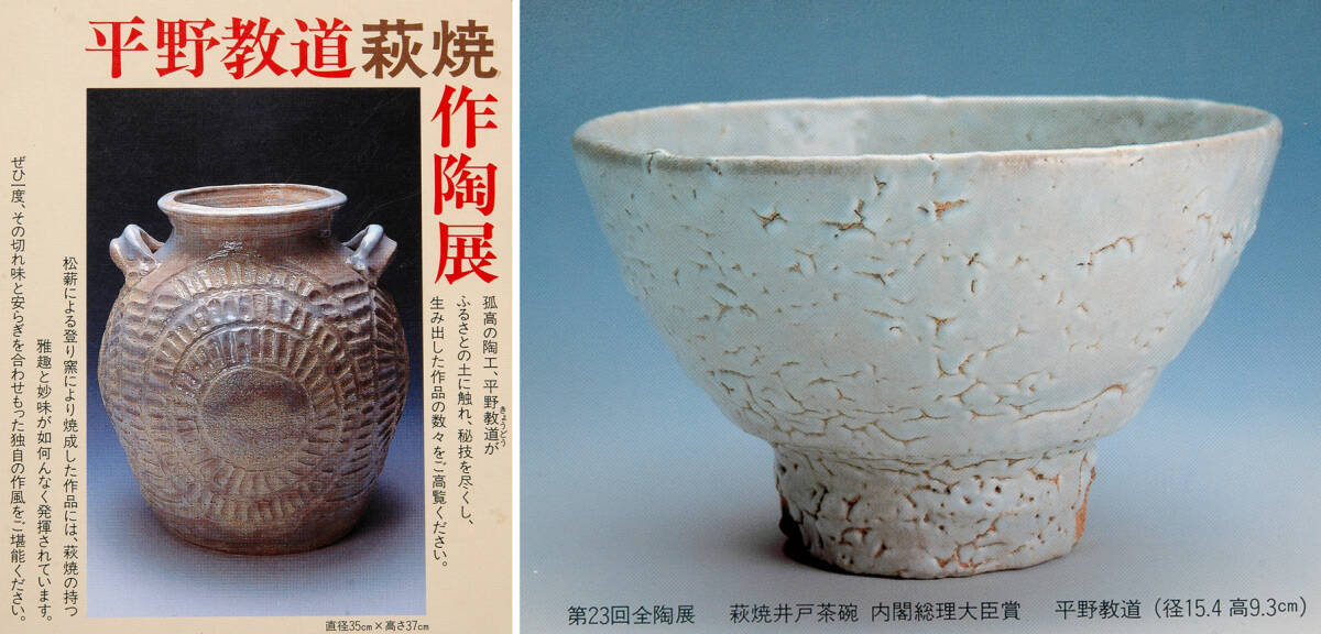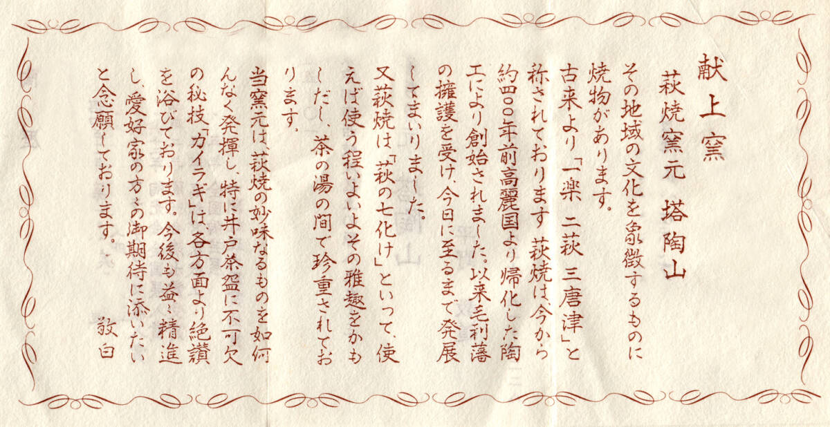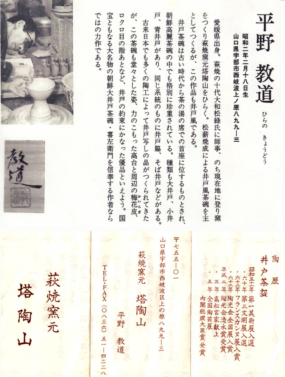 | * 商品説明 * 萩焼の抹茶碗で内閣総理大臣賞も受賞された平野教道 作の鶴首の1輪挿しです。高さは約22cmで、口径は約3.8cm、挿し穴は約1.2cm、底の径は約5.1cmです。周りの景色が迫ってくるような感じがします。教道氏の作品には間違いはありませんが、陶印が入っていないようです。氏の抹茶碗などは都内のデパートでの展示販売会などでは氏の茶碗は50万円~200万円で取引されたとの事です。 かなり前に亡くなられましたので、もう造られる事はありません。教道 先生とは多少のご縁が有りまして、作品を回して頂きました。今回は花瓶を含めて14点ほどを出品しました。共箱等はございませんが、未使用品です。どうぞお役立てください。・・・茶の湯の世界では古から、茶人の茶碗の好みの順位、また格付けとして、『一楽二萩三唐津』と言われてきました。 1つ目、楽焼(京都)。 2つ目、萩焼(山口県萩市)、3つ目が唐津焼(佐賀県唐津市)です。 |