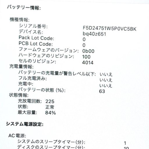 | 備考: | 充放電回数 225回 最大容量:84% PASS:0000 アクティベーションロック:OFF |