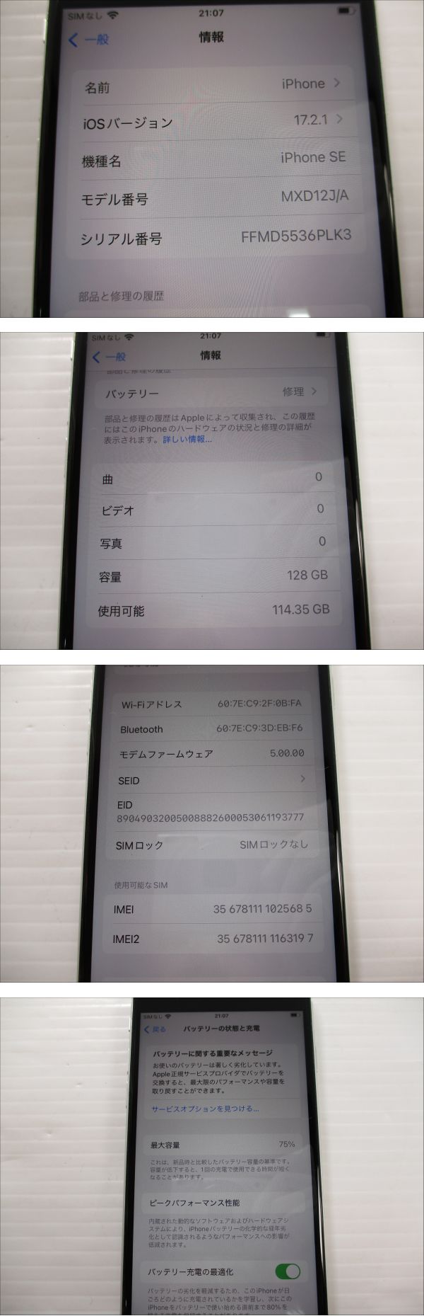 ※他 出品商品との「同梱発送不可」となります。 ※おまとめ依頼があった場合でも「個別取引」となりますので予めご了承くださいませ。 ※弊社指定の配送方法となりますので、配送方法変更不可となります。 (沖縄県は(60サイズ以上の商品)ゆうパックのみでの配送) ※領収書発行可能 (領収書は商品同梱となりますのでメール送信・別住所への郵送はできません) 領収書が必要な場合は、支払完了前までに取引ナビにてお知らせください。 ※落札より2日以上ご連絡が無い場合は「落札者都合でのキャンセル」となります。 ------------------------------------------------------------------------------------------- 【機種】iPhone SE 第二世代 【キャリア】docomo 【容量】128GB 【型式】MXD12J/A 【カラー】ホワイト 【動作】通電確認済 ※充電可能/電源入ります(出品時) ※傷・汚れ有。長期保管の中古商品、現状でのお渡しとなりますので、画像にてご確認の上ご入札お願いいたします。美品・完品をお求めの方は入札をお控えくださいませ。 【バージョン】17.2.1 【IMEI】 ※利用制限(docomo):〇 【SIMロック】無し ※付属品につきまして、画像に写っているものが全てとなります。 ※アクティベーションロックは解除済みの商品となります。 ※商品の詳細につきまして、専門業者ではございませんのでお答えできかねる場合がございます。 ※状態に関して、経年劣化による、小傷や汚れ等はご了承くださいませ。 見落としがある可能性も御座いますので、詳細は画像にてご確認頂き、画像にてご判断頂ける方のみ御入札をお願い致します。 ※電化製品・精密機器等の保証はございません。 | |||