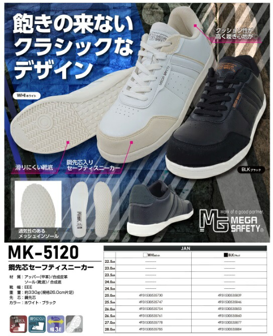 喜多 KITAMK5120※販売はタイトルの商品です。-----メガセーフティ MEGA SAFETYシリーズ-----・飽きのこないNeoクラッシックなデザイン・脱ぎ履き便利なローカットタイプ・ホールド性の良いシューレース(紐)・つま先部鋼先芯ガード入りのセーフティシューズ・クッション性の良い靴底をセットアップし足をしっかりホールドするシューレース仕様・靴内部の通気性を高める通気性のあるメッシュインソールを採用・アッパーデザインは、パンチングの通気口にシンプル、クラッシック、カジュアルという言葉がマッチするデザイン・どんな作業服ともコーディネートしやすく飽きのこないデザインがGood・履き心地のよいクッションソールを搭載した、セーフティスニーカーの新定番■仕様アッパー材質:合成皮革ソール材質:合成底靴幅:EEE重量:約380g(規格26.0cm片足)先芯:鋼先芯■JANコード25.0cm:493153053573025.5cm:493153053574726.0cm:493153053575426.5cm:493153053576127.0cm:493153053577828.0cm:4931530535785喜多 KITA