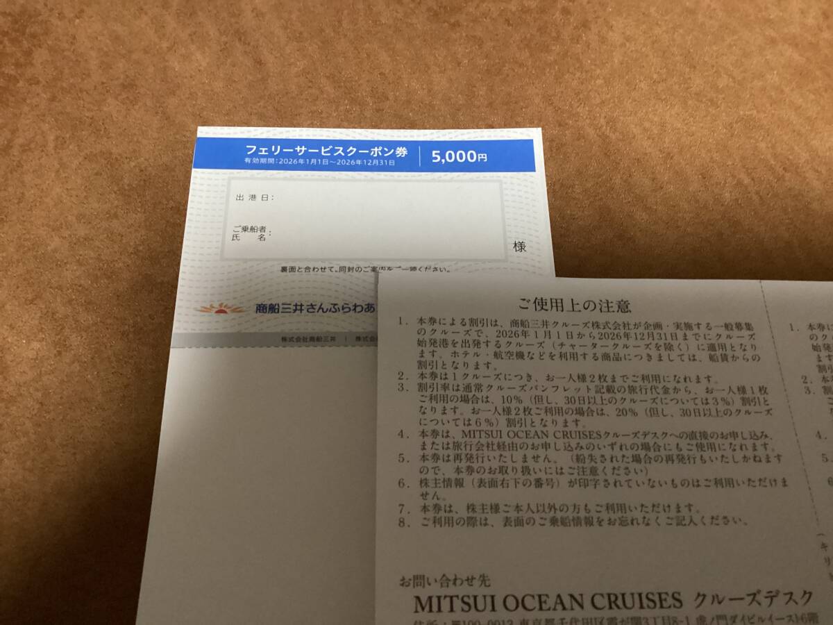 商船三井株主優待 さんふらわあ フェリーサービス共通クーポン券 5.000円です