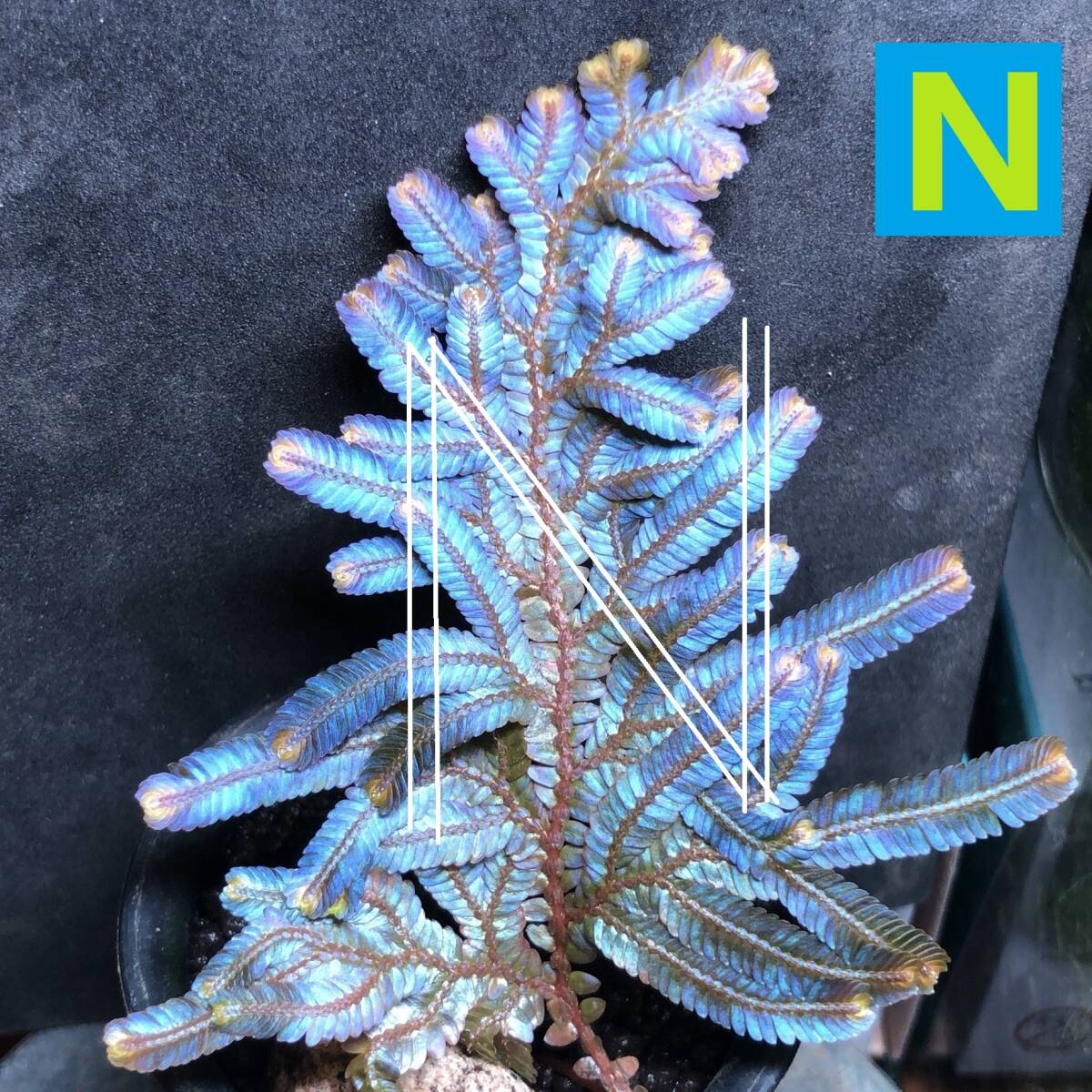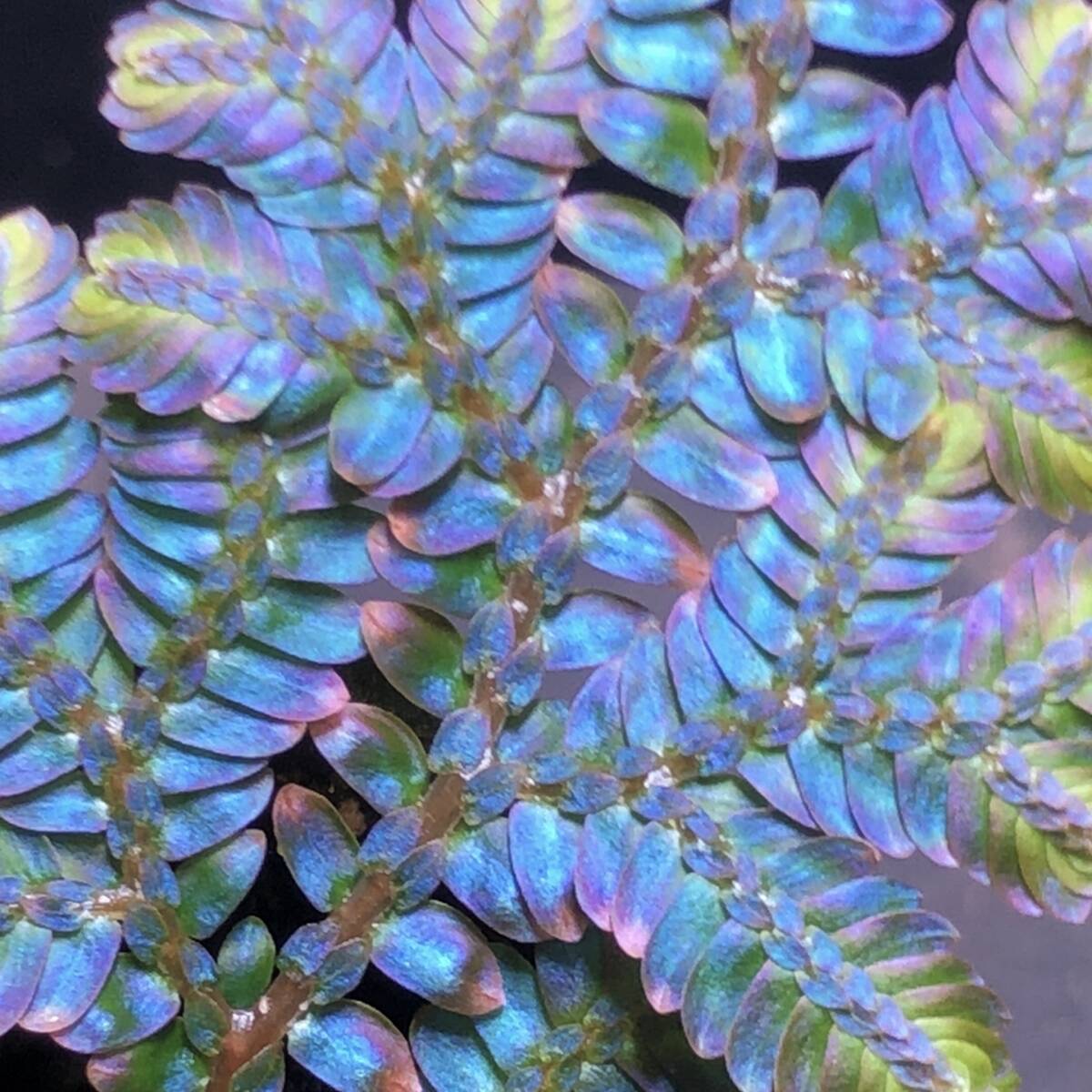 本株は、アクアリウムトールマン(※)で購入致した株を当方で養生し、株分けした増殖株です。 当時アクアリウムトールマンに3株入荷し、スタッフの方がYouTubeライブでその3株を紹介される予定だったみたいなのですが、ライブが始まる前に来店した当方が、その3株のうちひと際輝いていた1株を買ってしまったようで。ライブ中、定員さんが「1株めちゃめちゃ青い株があったんですけど売れキレてました。紹介できずにすみません。」というような一幕がありました。 本株は、その惜しまれためちゃ輝き株を増殖したものです。 (※)アクアリウムトールマン:大阪府八尾市に本店を置き、大阪に3店舗、広島に1店舗、千葉に1店舗を構えるアクアリムのプロショップです。店員さんの対応が神対応で有名です。気になる方はアクアリウムトールマンで検索してみて下さい。 | |||
