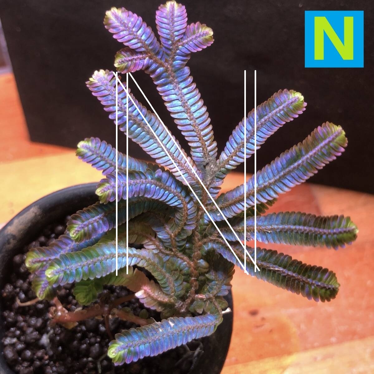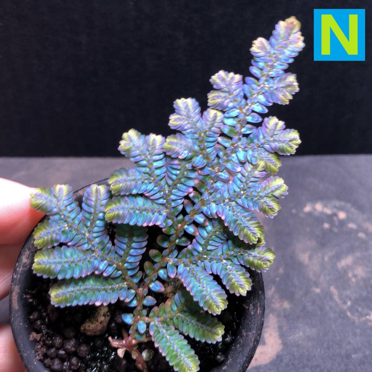 本株の特徴(※個体ばらつきがございます。下記説明は平均的な個体についての標準的な説明となっております。) 何といっても、このコバルトブルーに輝く光沢です! 光沢は、主に、葉の表面から垂直方向の角度に放たれますので、見る角度によって、光沢は弱く見えます。逆に葉を真上から見ると写真のように全体がコバルトブルー一色となります。これが構造色と言われるこの青光沢の特徴です。本物です。 光が強すぎると、葉焼けします。光量は抑えて下さい。直射日光はNG。直射日光は完全に遮断して下さい。ブラインド越しもNGです。 株を増やしたい場合 茎でもどこでもカットして、差し戻す方法があります。 ソイルやミズゴケなど、湿った状態にあるものに近づけると、茎でも葉でもどこでも、湿度を感知して発根しますので、差し戻しと言われる方法で、どんどん増殖させることができます。 葉焼けさせてしまった場合 葉焼けした部分は復活しませんが、成長点が死んでいるわけではありませんので、適切な環境に戻してあげたら、成長点からまた新たな新葉が生えてくれます。葉焼けした部分は元には戻りませんので、葉焼け部分を除去するか、差し戻すなどして、奇麗に整えましょう。 湿度 ガラス容器などに入れて、多湿環境を保ってください。但し、葉が常に濡れているような環境は好みませんので、積極的な霧吹きはしない方がいいです。当方も霧吹きは特にしていません。容器内の湿度を保つために葉に掛からないように霧吹きする程度です。少しかかるくらいは問題ありません。べちょべちょはNGです。 成長速度 成長は結構早いです。当方が成長の遅いブセファランドラを中心に育てているから、そう感じるのかもしれませんが、当方の感覚では、みるみる成長してくれます。 最初は小さな葉のかけらを差し戻しただけなのに、数カ月後には見事に容器いっぱいに葉を広げてくれます。 育成方法 上記に、勝手にいろいろ書きましたが、やはり専門店さんのアドバイスが一番です。専門店さんのアドバイスを得ながら、育成されることを推奨いたします。ベテランの方にとっては、釈迦に説法ですね。育成をお楽しみ下さいませ。 |