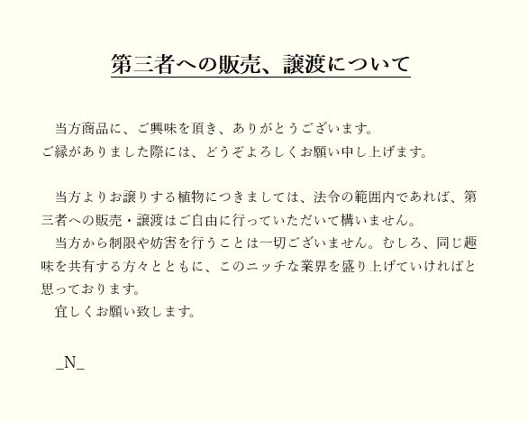 ※落札者様に対してフェアな販売の仕方を心がけ、以下の対応に努めております。 。 ・本当の姿をはっきり映し出した写真や映像のみを掲載致します。 。 (青い光を横から当てたり、作為的な画質調整など、論外でございます。) 。 ・落札者様にリスクを負わせないよう十分養生した株のみを出品致します。 。 (未養生の物は決して販売致しません。) 。 ・魅力を十分に引き出し、何と言っても当方が好きな株を出品致します。 。 (当方が好きじゃない物は販売致しません。) 。 ※人気の高い種を提供し続けられるようがんばります。 。 ※商品取引はいつも迅速です。決してお待たせ致しません。 。 ※頂きましたご質問は決して放置致しません。即回答させて頂きますので、 。 何なりとご質問下さいませ。 。 ※誠実な対応を日々心掛けております。ご指摘等ございましたら真摯に受け止めさせて 頂きます。 。 【第三者への販売、譲渡について】 https://www.instagram.com/p/DQNgEpsExDP/?utm_source=ig_web_copy_link&igsh=MzRlODBiNWFlZA== ※当方よりお譲りする植物につきましては、法令の範囲内であれば、第三者への販売 ・譲渡はご自由に行っていただいて構いません。 。 ※当方から制限や妨害を行うことは一切ございません。むしろ、同じ趣味を共有する 方々とともに、このニッチな業界を盛り上げていければと思っております。 。 ※入手元が当方であると公開頂いても全く問題ございません。匿名のままだったら、 説明にも苦慮されると思いますし。当方ではそういった匿名の制限も行いません。 ※また、入手元として信頼を頂くわけですから、その信頼を裏切らないよう、今後も 誠実な対応を続けて参る所存です。 。 |