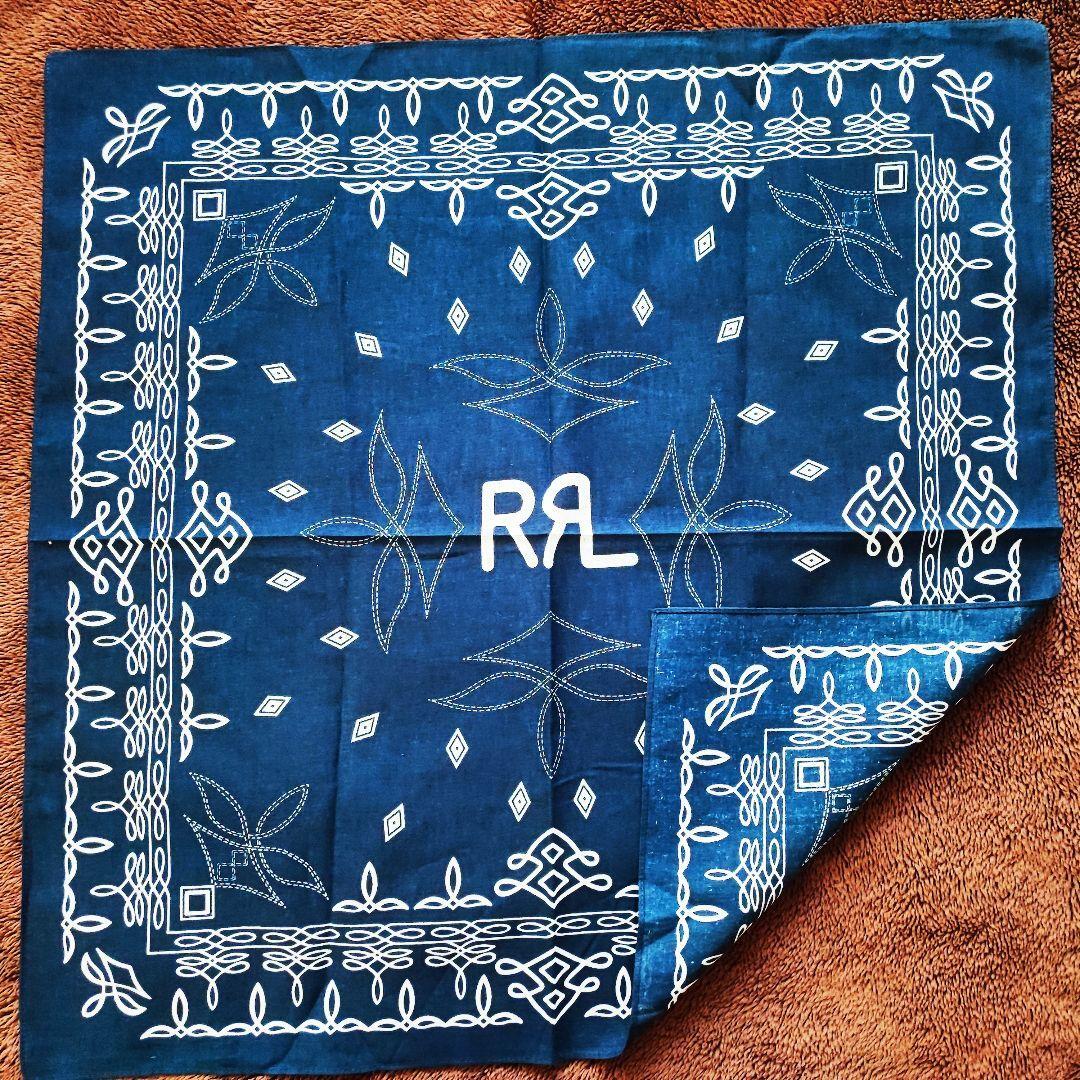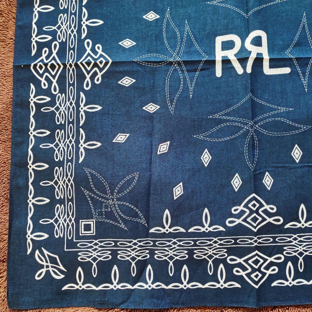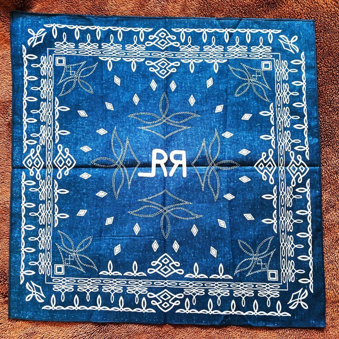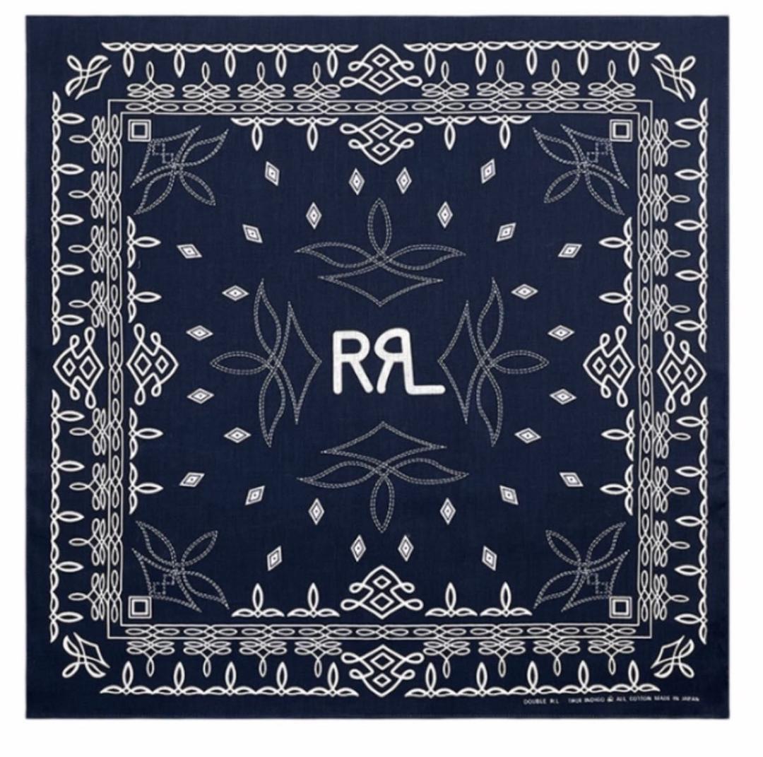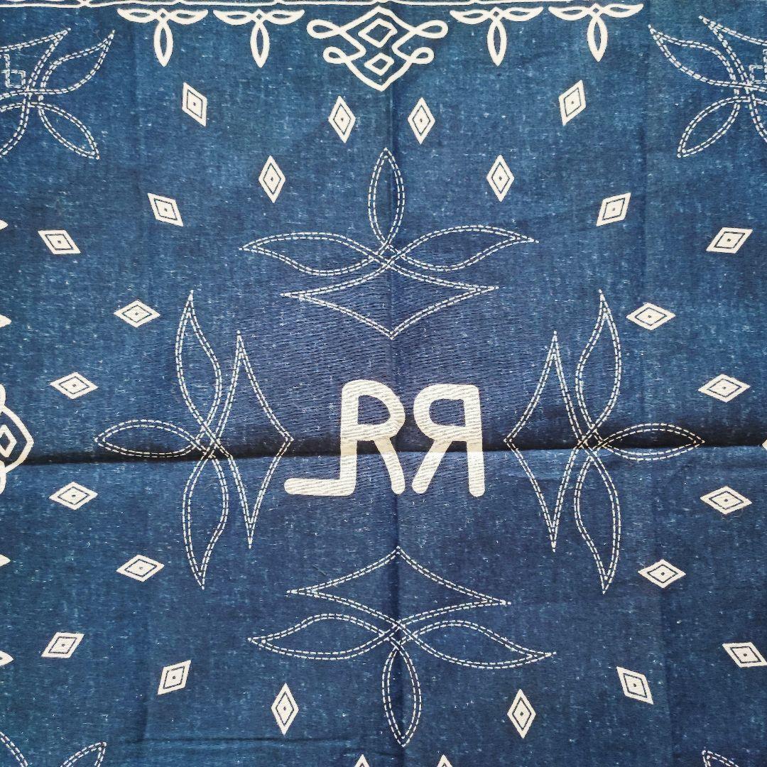 ・ネイビーベースにホワイトの模様が映える、クラシックな雰囲気の大判バンダナです。中央には「RRL」テイストのロゴデザイン入りで、アメカジやヴィンテージファッションとの相性も抜群。