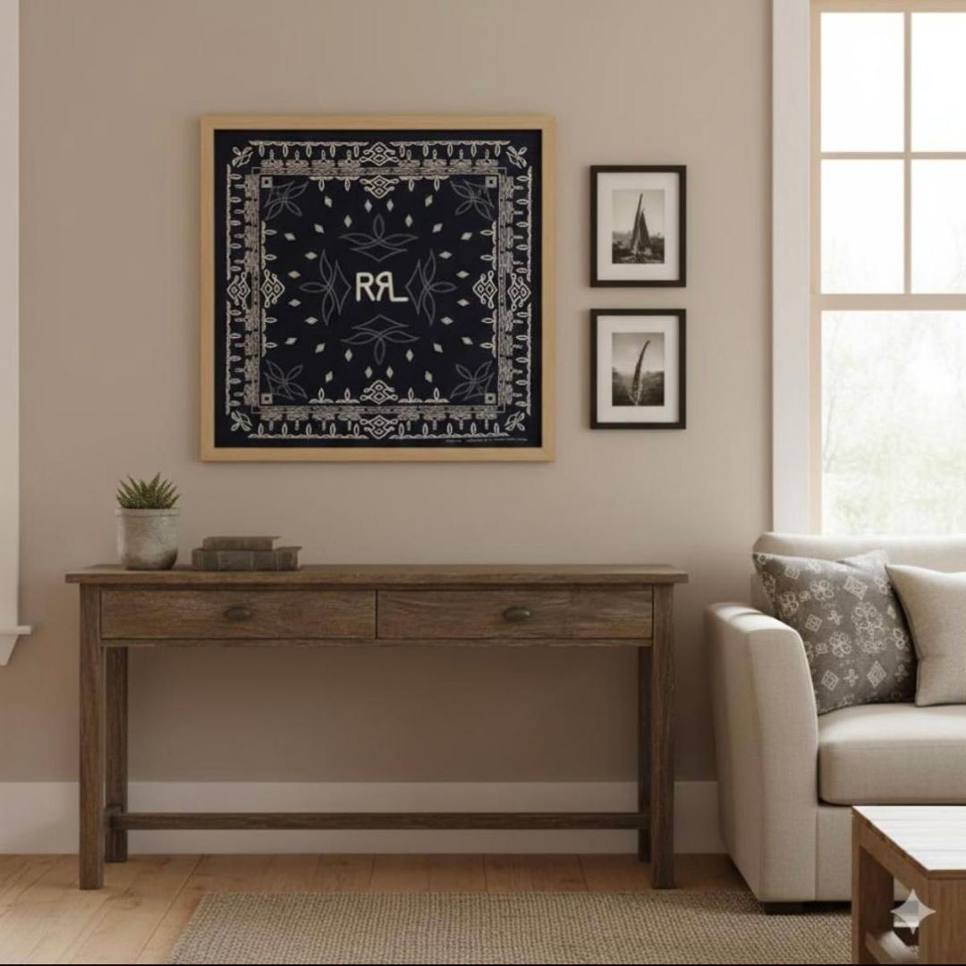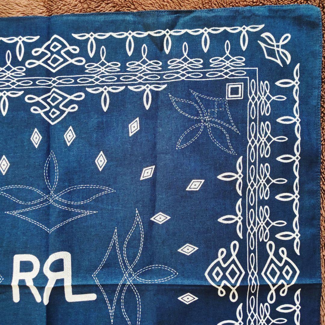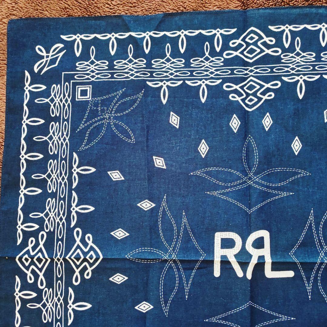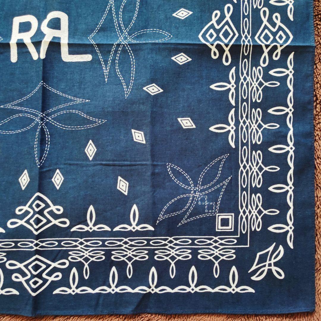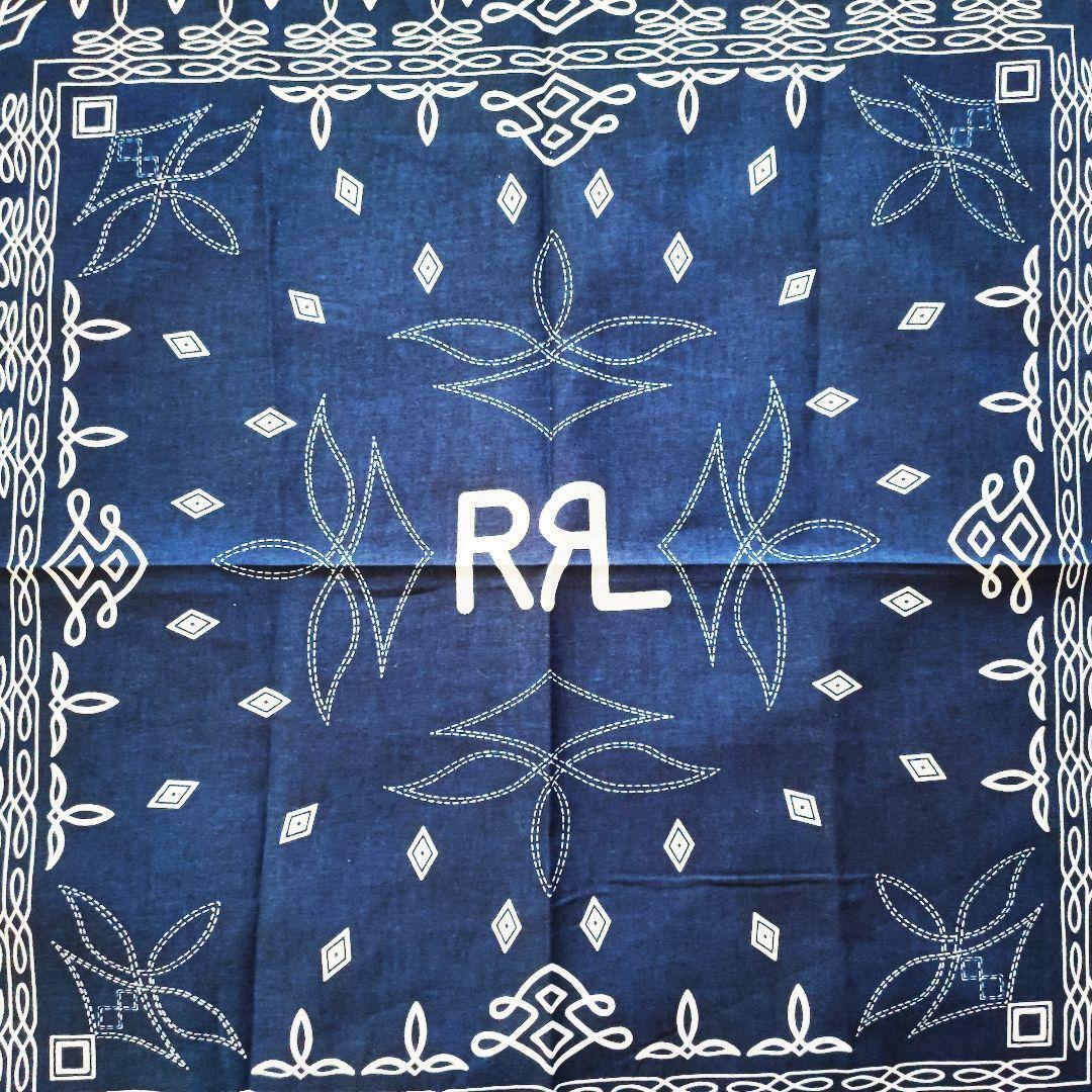・ネイビーベースにホワイトの模様が映える、クラシックな雰囲気の大判バンダナです。中央には「RRL」テイストのロゴデザイン入りで、アメカジやヴィンテージファッションとの相性も抜群。