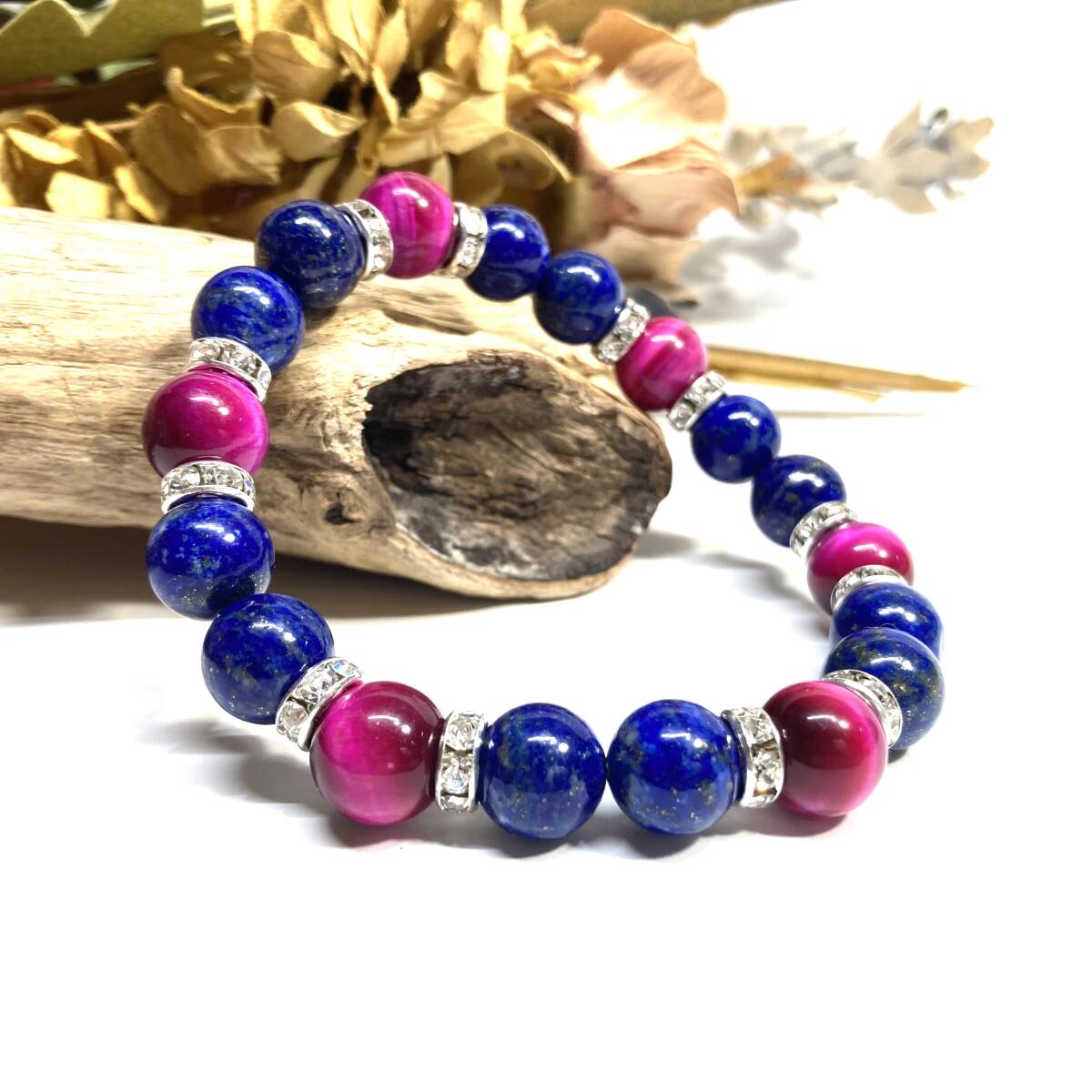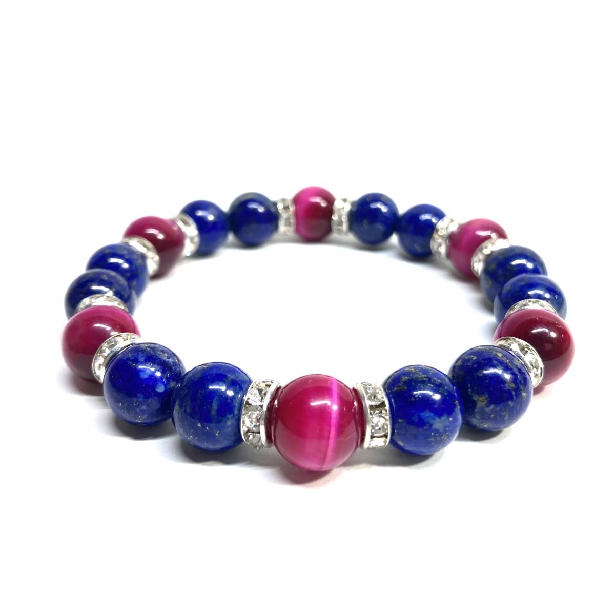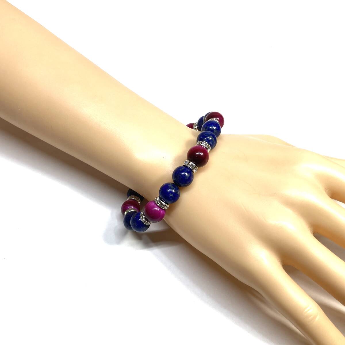 こちらは、ラピスラズリとピンクタイガーアイを組み合わせたパワーストーンブレスレットです。間にはロンデルを挟み高級感あるデザインに仕上げております。石大きさは腕にも馴染みやすいように10mm玉で内径約18cm(伸可能)です。(サイズ変更の場合は取引ナビにてご連絡をお願いします。) 数に限りがございますので気になる方はお早めにどうぞ。