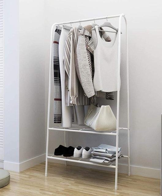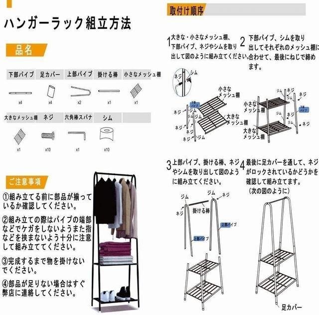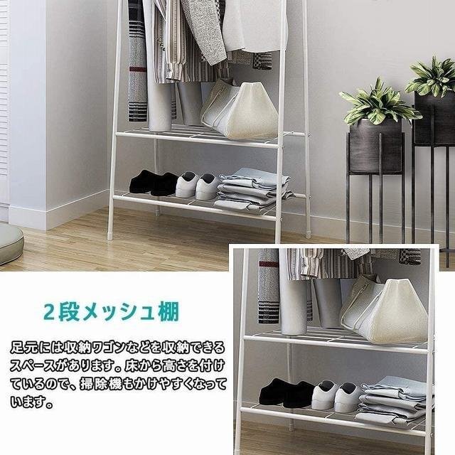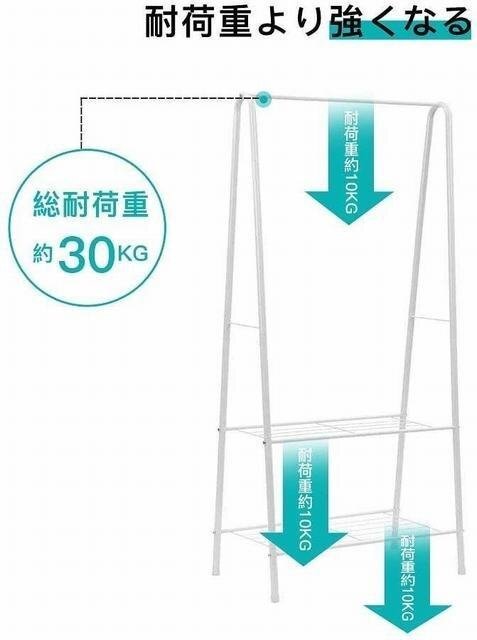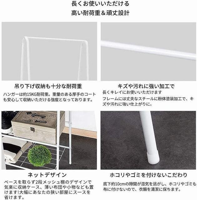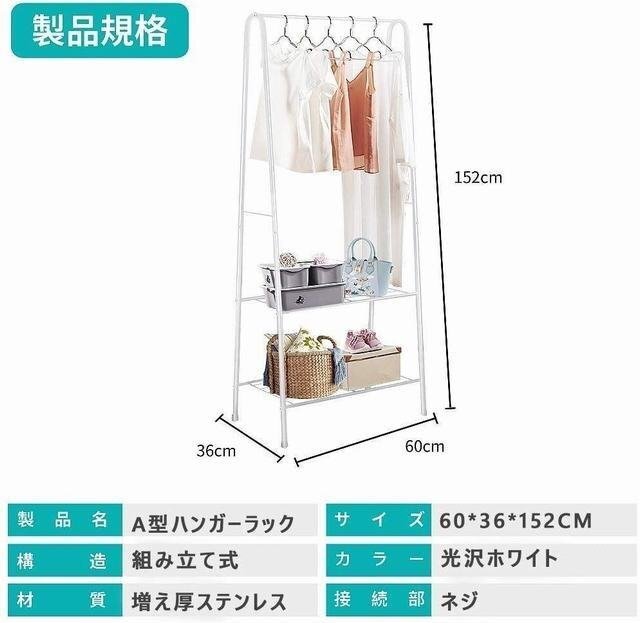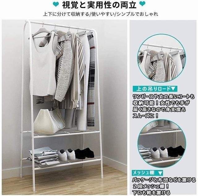 【安定性 高耐荷重】 商品サイズ(cm):幅約60x奥行約36x高さ約152。 このハンガーラックは頑丈なスチール製のハンガーラックなので、強度は強くて、耐荷重は30kgまで達しまていますが、たくさん物を置いでも歪みにくいです。三角と4本足で倒れにくく頑丈な設計なので、安定性が優れます。ゴム製カバー付属しておりますから、安定感はもちろん、床に跡が残る心配もいりません。 【収納性抜群】 洗濯物干しは2段の構造で色んな物をきちんと整理できます。かけるとおける二つの機能を備えています。上にコートや洋服などを掛けることができる。また下に2段メッシュ棚をつけており、帽子、カバン、収納ケース、靴、タオル、薄い布団や小物などのファッション小物の収納にご活用いただけます!気楽に服の収納以外に、部屋干しのアイテムとして梅雨時期の物干しとして活躍します。 【軽量&防錆&耐腐食】 洋服掛け棚本体はわずか3kgで、持ち運び便利です。本体の表面は水、錆、腐食に強いエポキシ塗装を施されて耐久性が素晴らしいです。湿気の多い場所でもご安心にお使い頂けます。布団干しとして使用出来、雨の日やベランダの無い家でも重宝します。またアイロンのちょい掛けや玄関のコート掛けとしても大活躍です。 【組立簡単&省スペース】 説明書によると、付属品のミニスパナで15-20分ほど楽々完成できます。女性や子供でも簡単に組み立てることができます。寮や単身赴任などにも気軽に使います。狭い玄関に置けるスリムな薄型サイズで、空いたスペースが無駄なく衣類や小物の置き場所になるアイデア収納です。ストレージボックスも置けてファッション小物等をひとまとめに出来、非常に便利です。 【スタイリッシュ】 収納力とデザイン性を兼ね備えたパイプハンガーラックです。自分の部屋に置きたくなる、見た目のインテリア性が高いハンガーラックを選びたい方におすすめです。おしゃれな雰囲気の北欧風デザインで、子供部屋、ランドリー、リビング、キッチンや玄関などに置きても違和感ません。お部屋をスタイリッシュに変身されます。