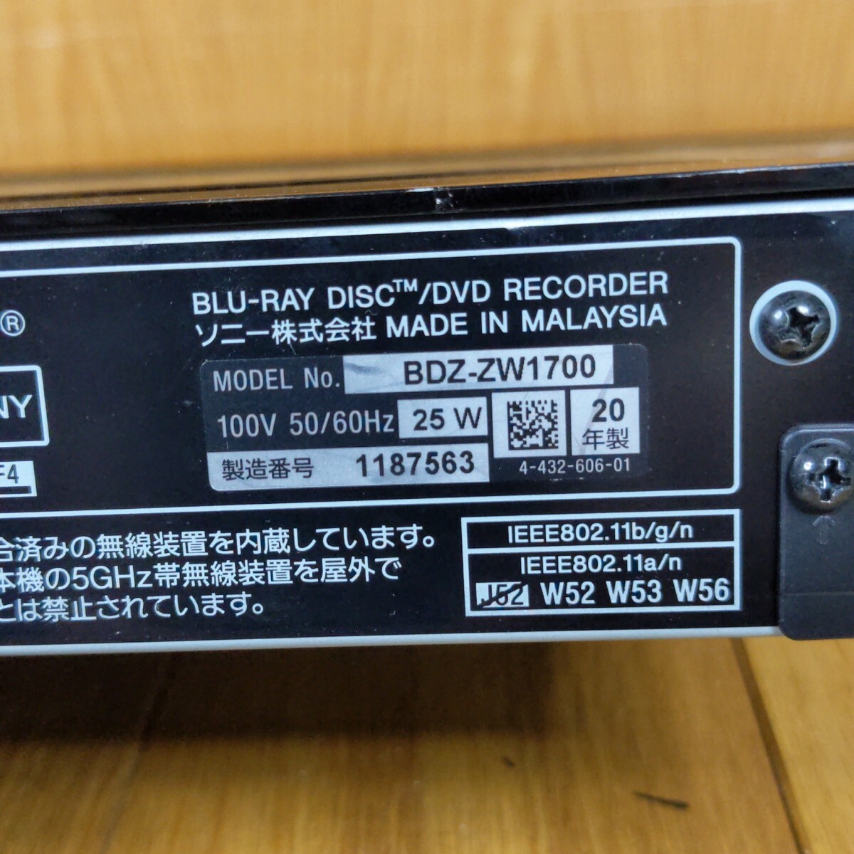 SONY BDZ-ZW1700 ブルーレイレコーダー HDD1TB 2番組同時録画 リモコン b-casカード 電源コード 0444