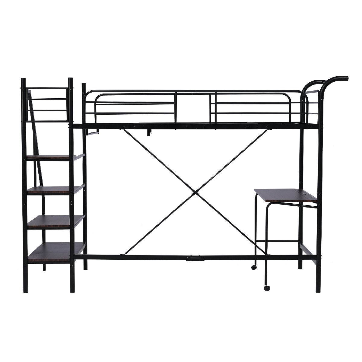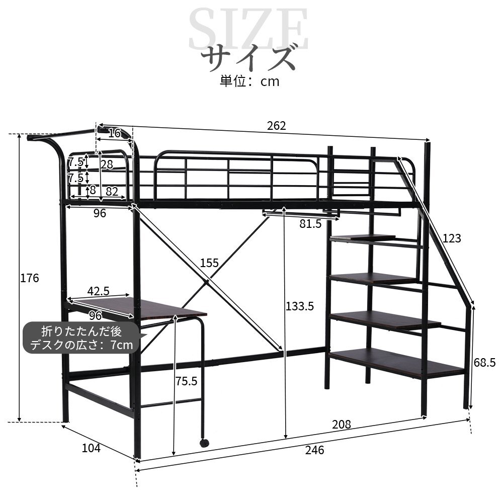 • 【折りたたみ式の便利なデスク】ロフトベッドの下部には、省スペースのため、折りたたみ式の机を設置。 勉強や仕事をするときに作業スペースとして使え、そのうえ、コンセント付き、充電が可能!デスクの脚にキャスターが付き。折りたたむことで、コンパクトなサイズになる。使わない時には簡単に収納できるので、スペースを節約することができる。