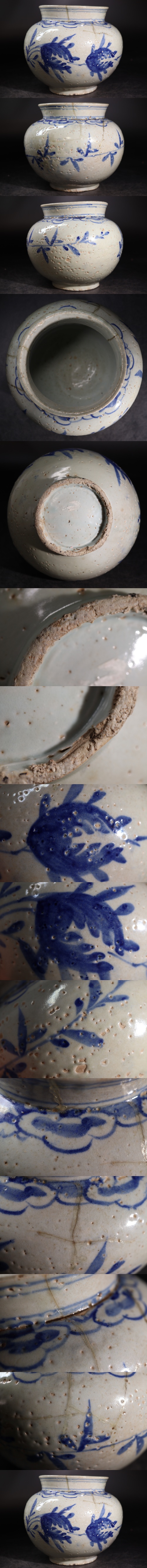 | 時代 李朝 染付 柘榴紋 丸壺 / 朝鮮古美術 壺 飾壺 花瓶 花器 煎茶飾 検索: G3251 |
