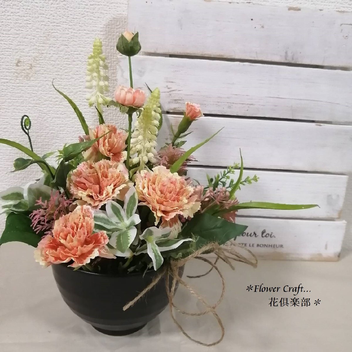 | * 花倶楽部 * アレンジメント ✿…お祝いにも花倶楽部のお花を…✿ ずっときれいに咲いているアーティフィシャルフラワー(造花)のアレンジメントをお届けします。 【 商品説明 】 上質なアーティフィシャルフラワーのアレンジメント サーモンのカーネーションに白の背の高いムスカリを合わせた優しく癒される作品です。 記念のプレゼントに、ご自宅のインテリアにお勧めです。 1点物の作品です。 ずっときれいに咲いているから、お祝いやプレゼントにも最適です。 サイズ 横幅 22cm 高さ 25cm 奥行 17cm 花器の高さ 8cm 丁寧に楽しみながら作ってみました。 気に入っていただければうれしいです。 お買い上げ前に、ご不明なこと等、 どうぞお気軽にお問い合わせください。 ◆発送について 宅配便・定形外とも、透明のラッピングフィルムで包んでから、プチプチの梱包材で包み 段ボールに入れて丁寧に梱包して、お届け致します。 発送の手配は月~金曜日の平日となります。 (土・日・祝日は原則、休みですが、お急ぎの方はどうぞ、ご連絡くださいませ) ・宅配便はゆうパックで発送致します。 お届けの時間指定ができます。 午前中 12時頃~14時頃 14時頃~16時頃 16時頃~18時頃 18時頃~20時頃 19時頃~21時頃 20時頃~21時頃 ◆お花・花器の破損について 至急ご連絡をお願いします。 お客様のご負担にならないように 個別に善処させていただきます。 ◆返品交換について お客様のご都合の場合は、送料お客様負担で承ります。 到着より2日以内で至急、ご連絡をお願いいたします。 気持ちの良いスムーズなお取引に心がけますので、 どうぞよろしくお願いいたします。 |