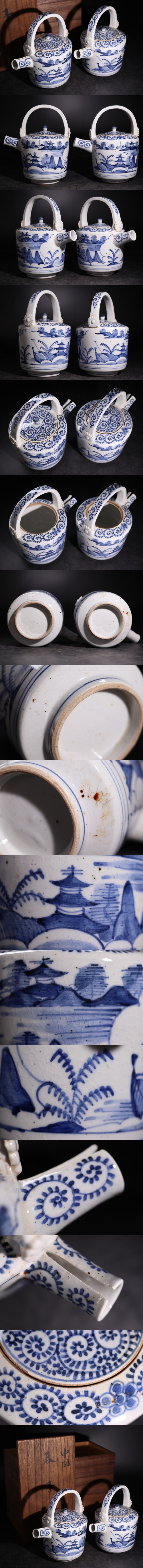 | 時代 染付 蛸唐草 ・ 風景紋 急須 二点 木箱付 / 古伊万里 有田 茶器 煎茶道具 .G3241 |