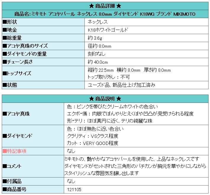 | 商品名:ミキモト アコヤパール ネックレス 8.0mm ダイヤモンド K18WG ブランド MIKIMOTO | |