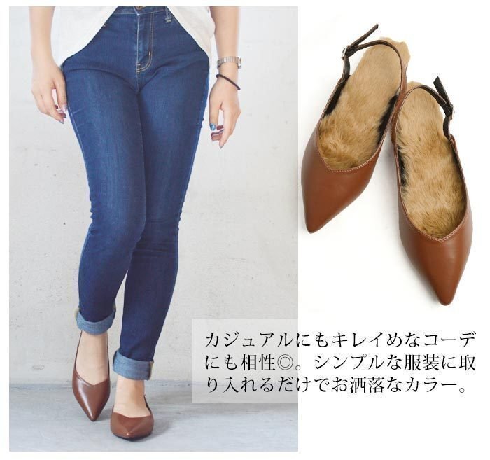 在庫処分■新品【23.5~24cm】レディース フラット パンプス ファー ストラップ付 ポインテッドトゥ サンダル カジュアル 靴【エコ配送】